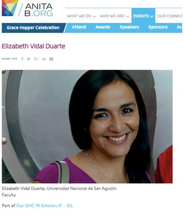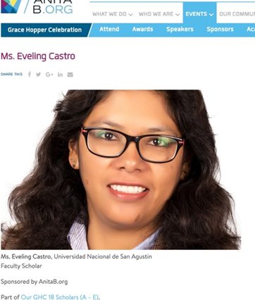 Dada su importante labor de mentoría e impacto social las profesoras Eveling Castro y Elizabeth Vidal fueron invitadas a participar becadas en la conferencia más grande del mundo de mujeres en STEM: Grace Hopper Celebration (GHC), durante el 2018 y 2019 respectivamente. A nivel mundial GHC , sólo brinda 50 becas para académicas. La UNSA estuvo presente por dos años consecutivos.