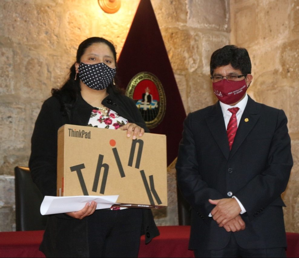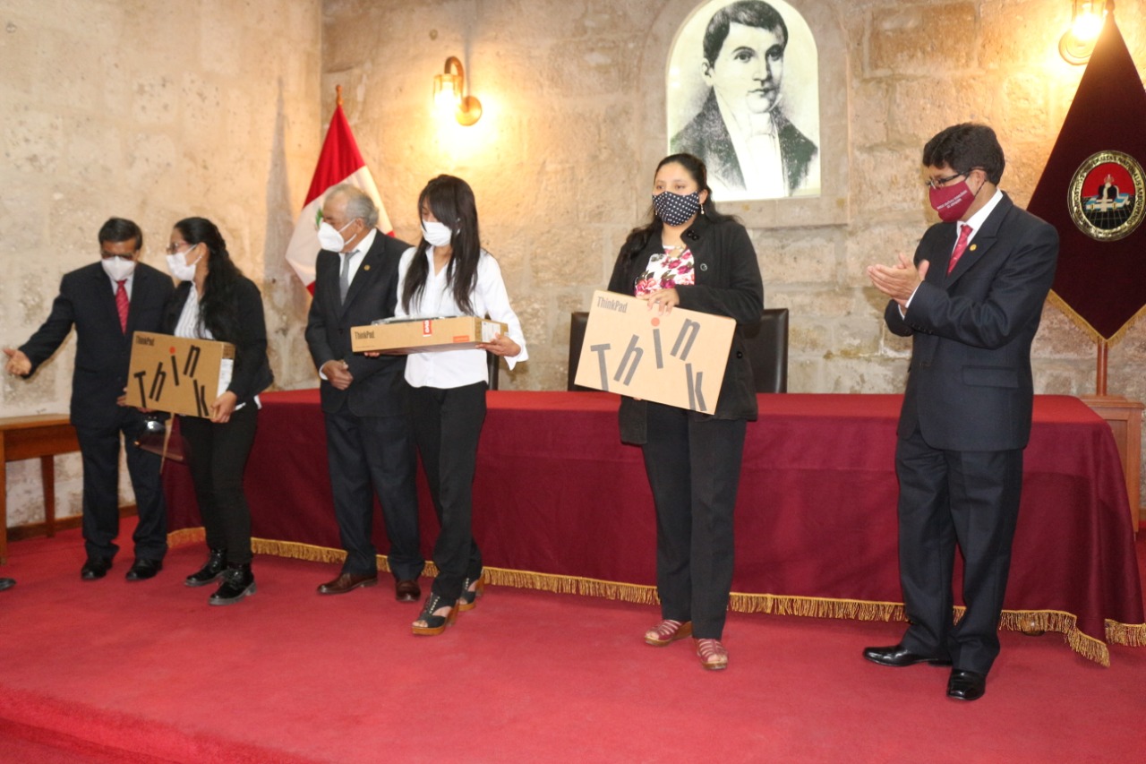 El rector agustino, los directores y decanos, junto al representante de la empresa Southern Perú, Cesar Chávez, hicieron la entrega de laptops, tablets y celulares de última generación a los ganadores.
