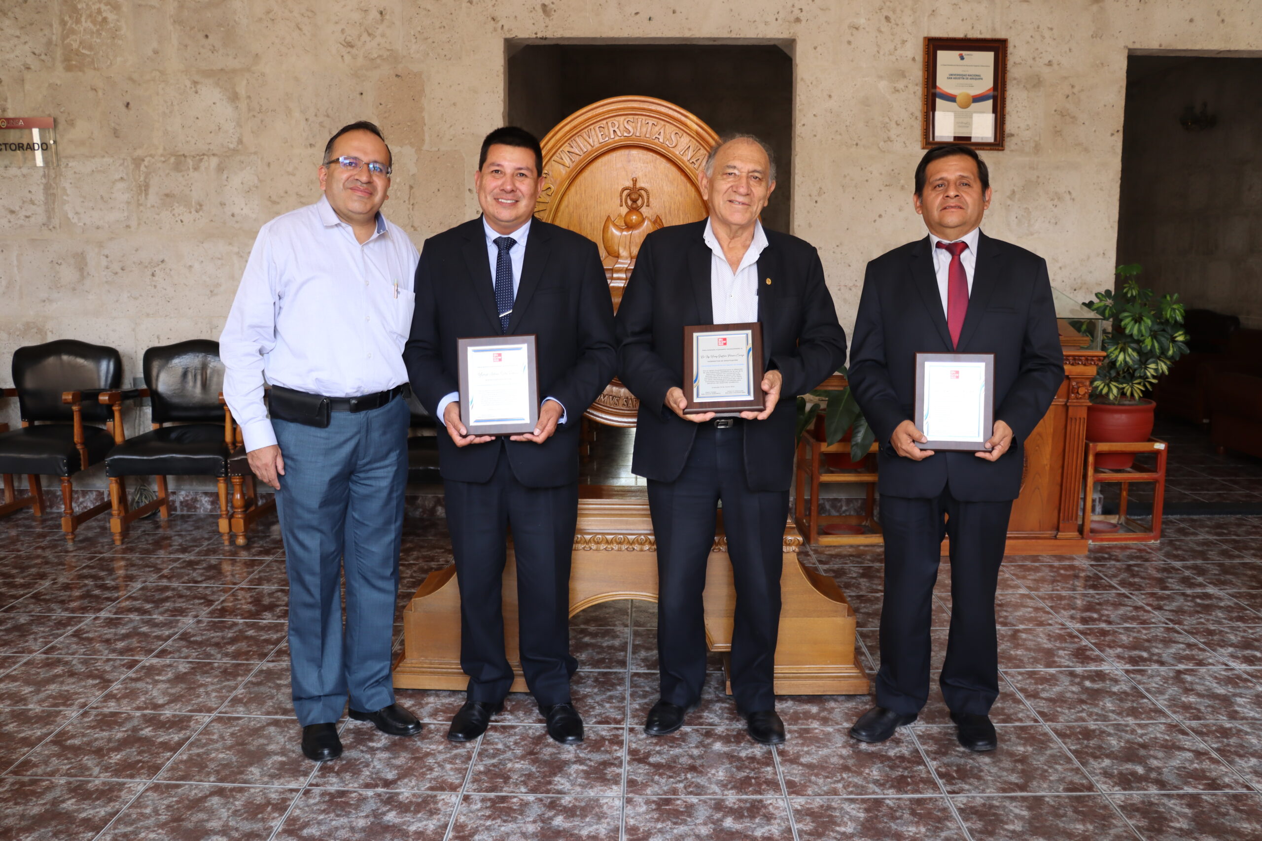 El consultor de ventas educativas de la editorial, Víctor Hugo Valenzuela, visitó el Rectorado de la UNSA y conversó con el vicerrector de investigación, Dr. Henry Polanco Cornejo, entregándole esta distinción junto al Jefe de Recurso Educativos, Yosheff Ortiz Valdivia, y a Luis Álvarez Rodríguez, jefe de la Biblioteca Virtual.