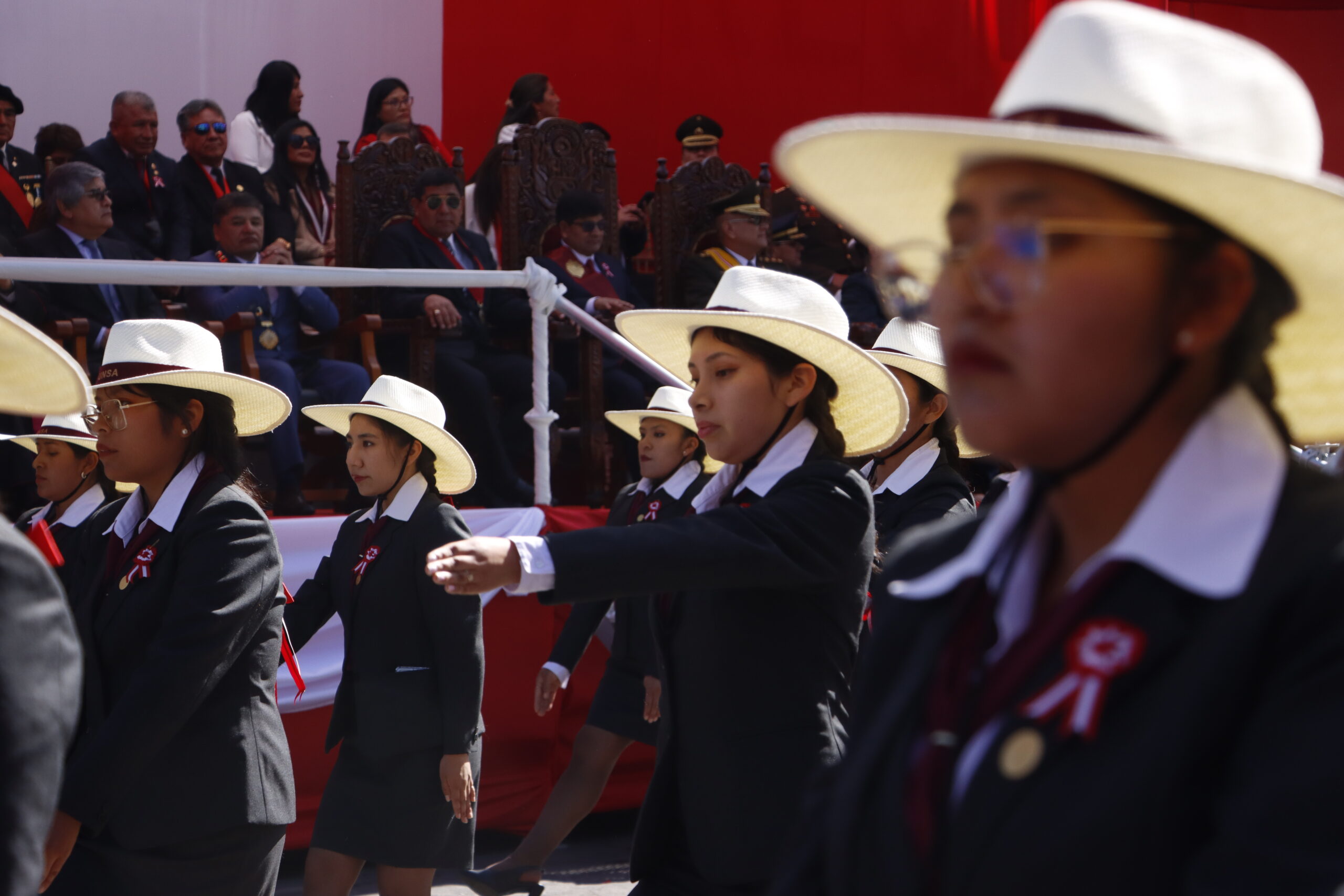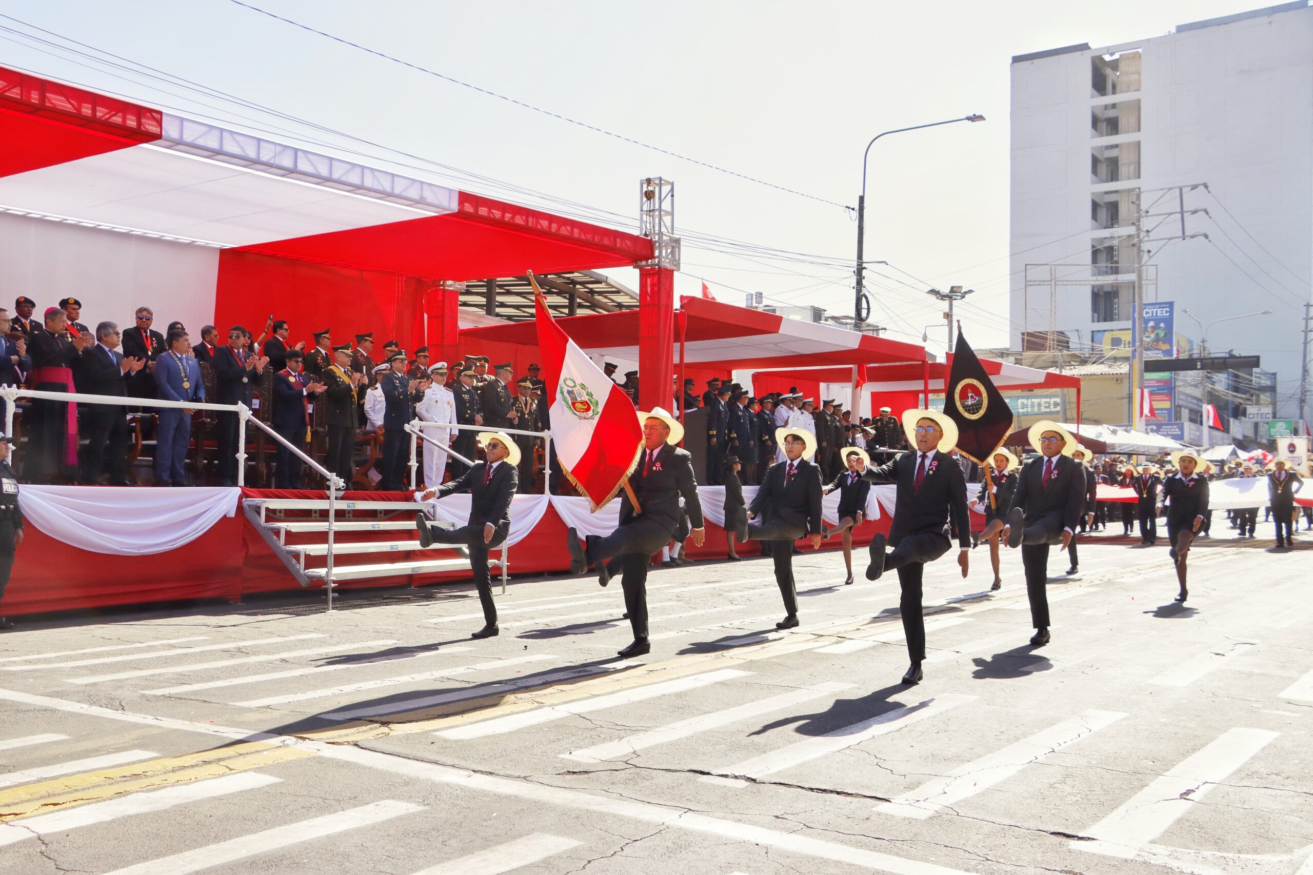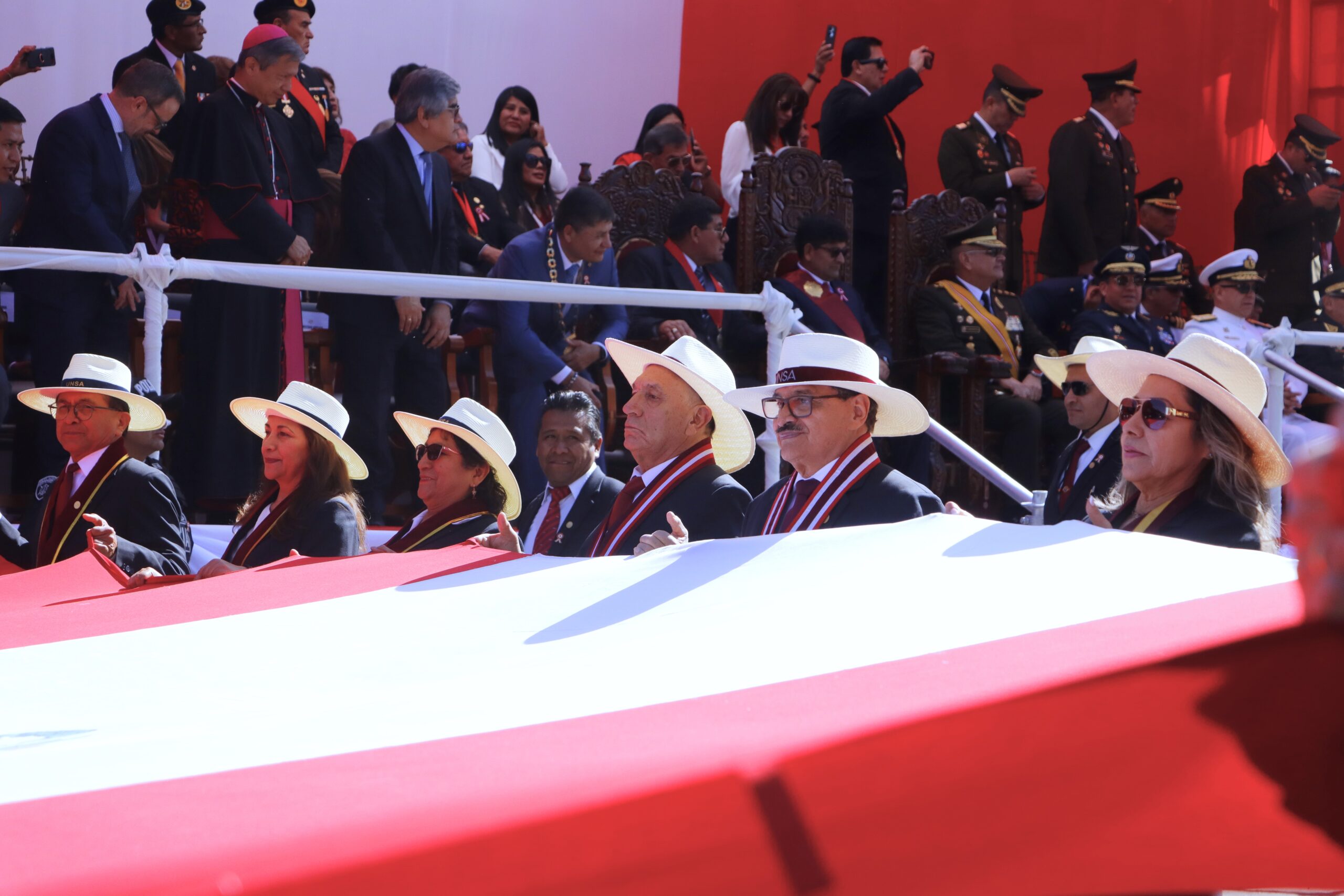 Sosteniendo la bandera nacional, marcharon el rector, Dr. Hugo Rojas Flores; el vicerrector de investigación, Dr. Henry Polanco Cornejo; la secretaria general, Dra. Ruth Chirinos Lazo; decanos y jefes de oficina. Durante el recorrido, el público reconoció el paso de la universidad y celebró con aplausos su participación.