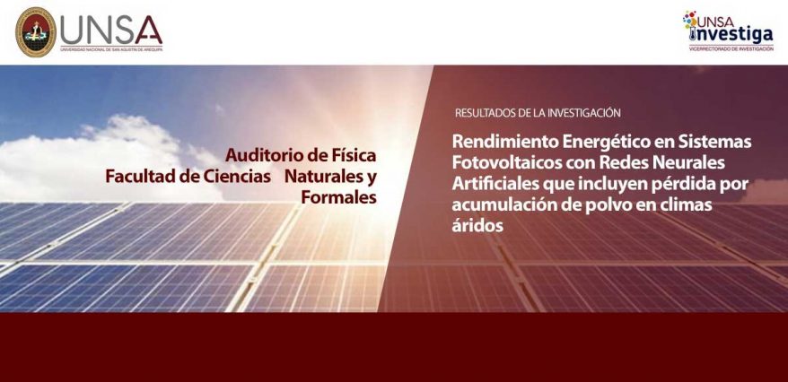Presentación Pública de los resultados del Proyecto de Investigación: «Rendimiento Energético en Sistemas Fotovoltaicos con Redes Neurales Artificiales que incluyen pérdida por acumulación de polvo en climas áridos». Financiado por la Universidad Nacional de San Agustín de Arequipa Nº de contrato: IBA 0033-2016.
