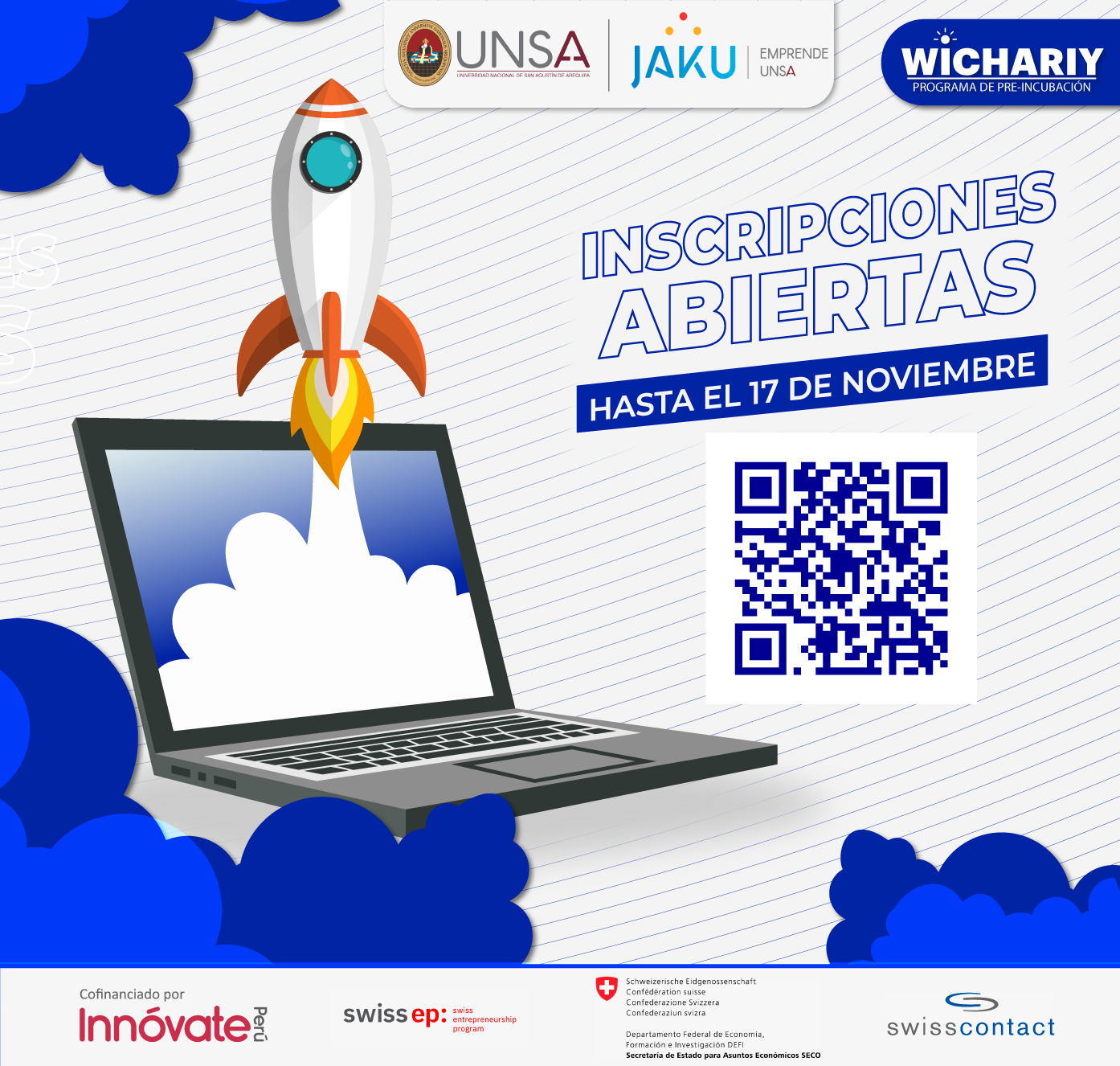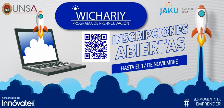 La incubadora de Empresas JAKU Emprende UNSA de la Universidad Nacional de San Agustin de Arequipa invita a toda la comunidad emprendedora e innovadora de nuestra Universidad y la macro región sur del país, a ser parte del Programa de Pre-Incubación denominado «WICHARIY 2020«.