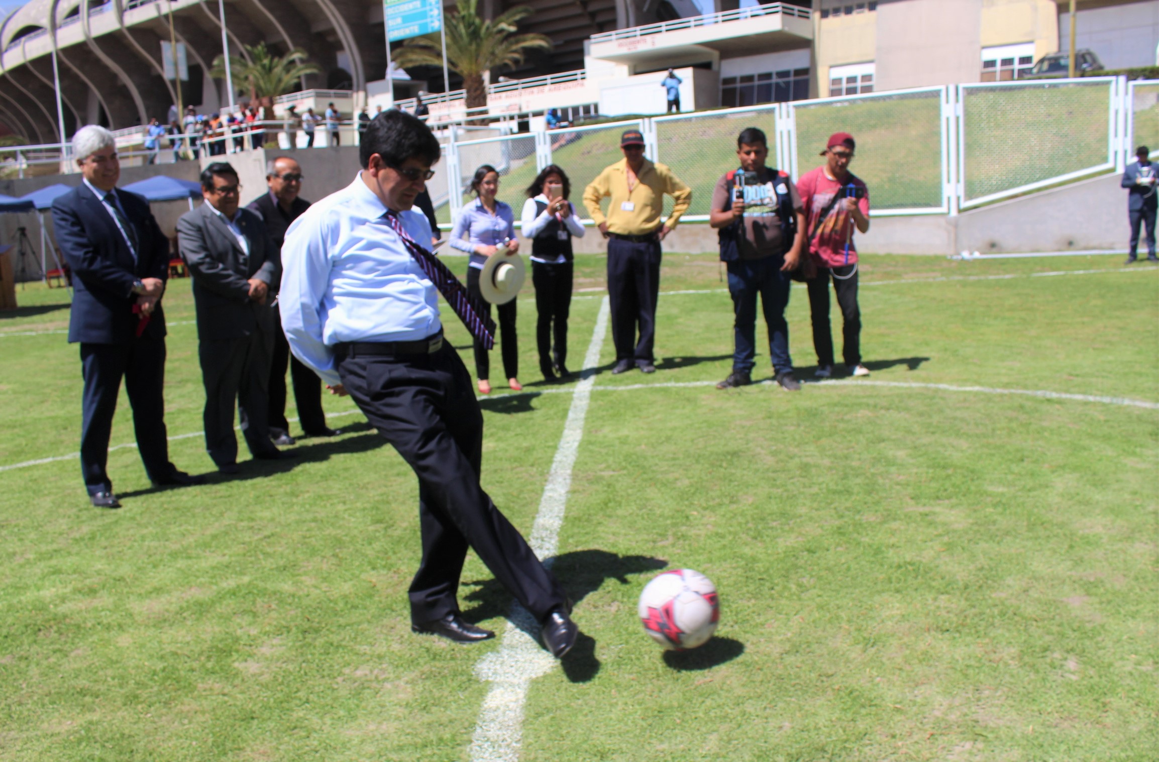 Durante la entrega del espacio deportivo, las autoridades de la UNSA y del FBC Melgar dieron el play de honor inaugural de esta cancha.