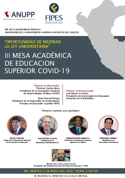El coronavirus está afectando enormemente a todos los sectores del país, incluyendo al educativo, los participantes darán a conocer cómo se han comportado los actores del sistema universitario frente a la pandemia, cómo se visualiza el futuro de las instituciones de educación superior, qué acciones relevantes deberán implementar las universidades peruanas en este nuevo contexto y cuáles son los cambios que propondrían para mejorar la Ley Universitaria.