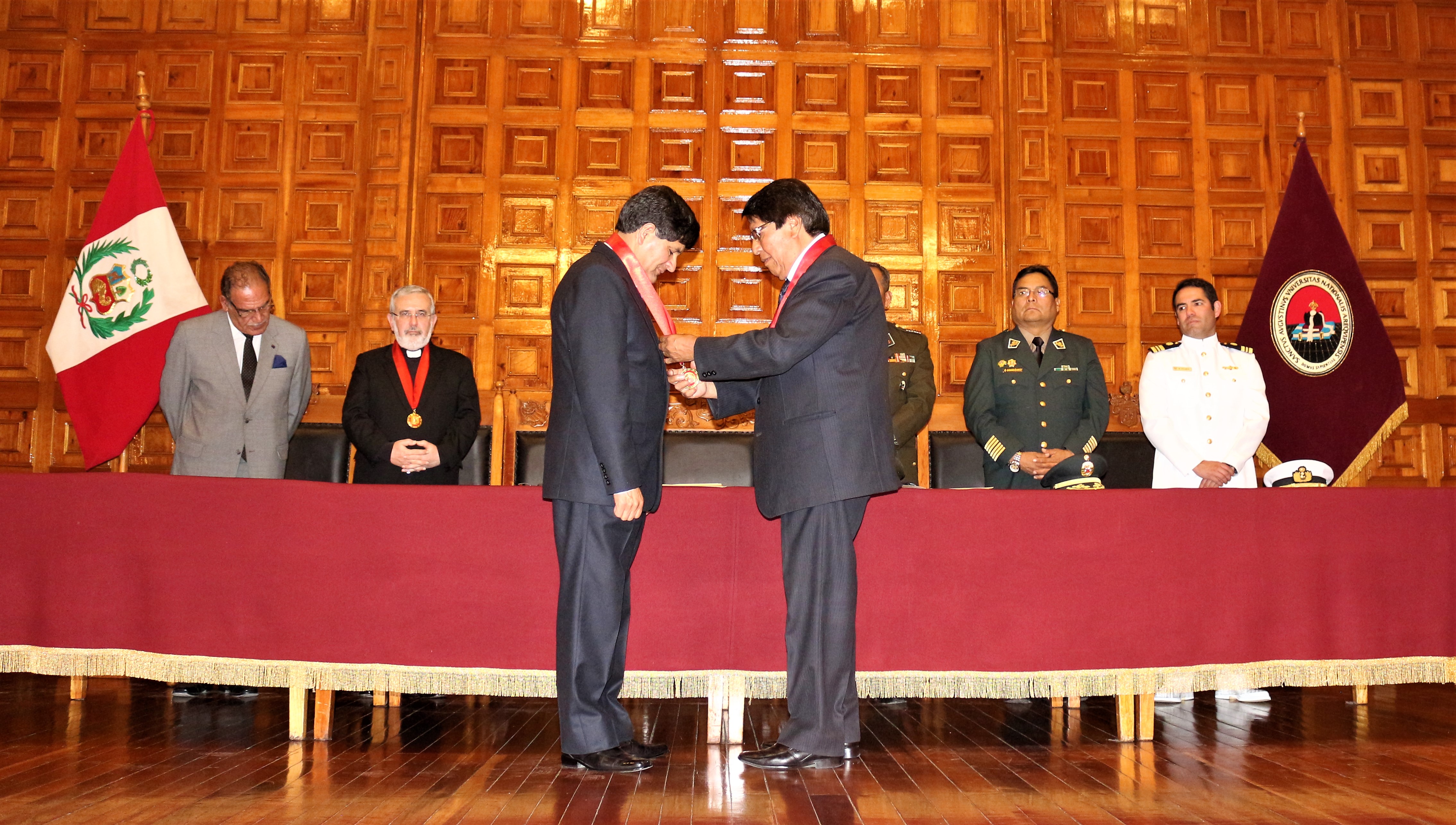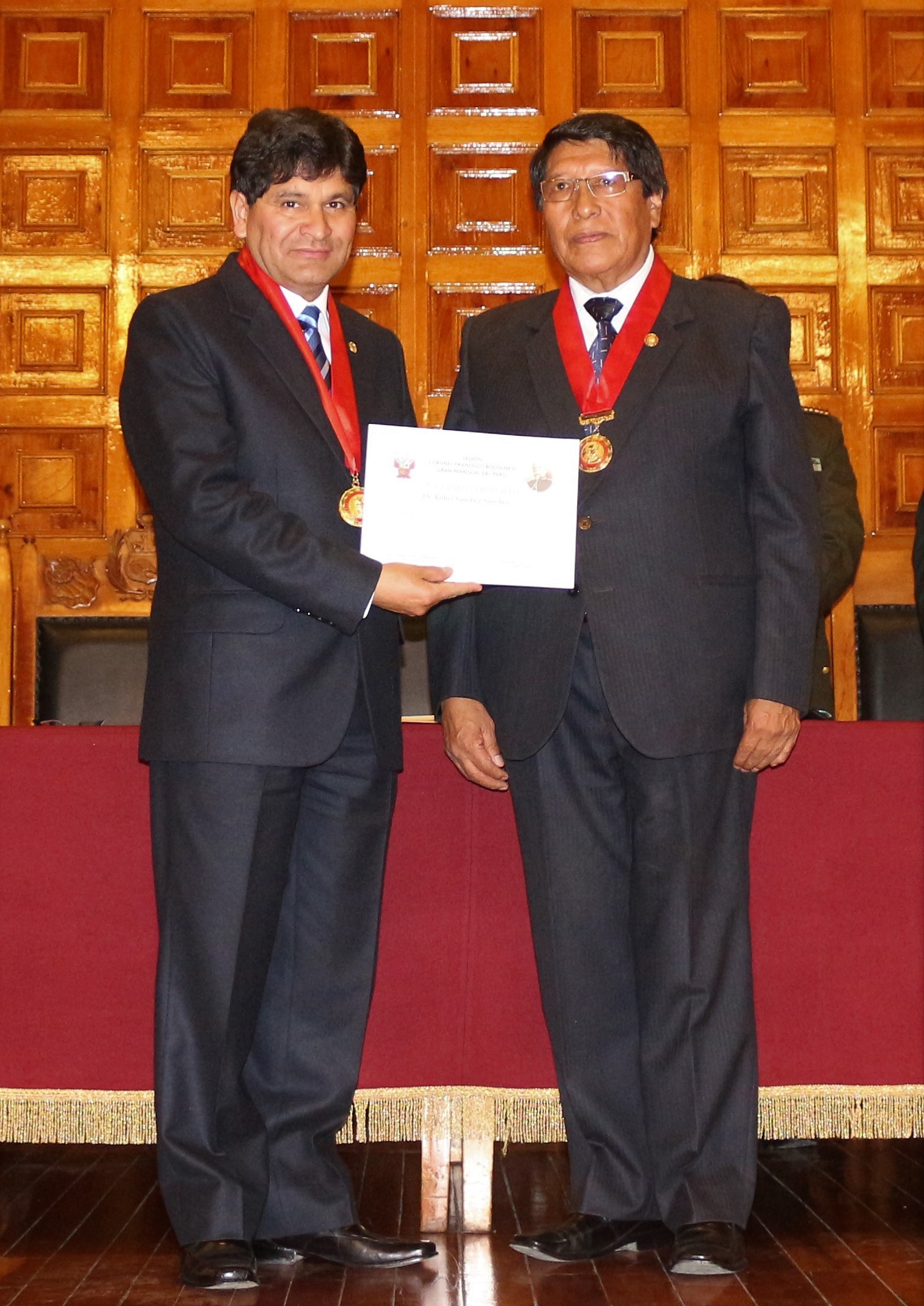 La máxima aut oridad agustina recibió el Diploma de Honor y Medalla, impuesta por el Presidente de este grupo legionario, Dr. Fortunato Turpo Choquehuanca, quien resaltó la contribución desinteresada de la universidad en honrar la memoria y conservar los valores del Héroe de Arica.