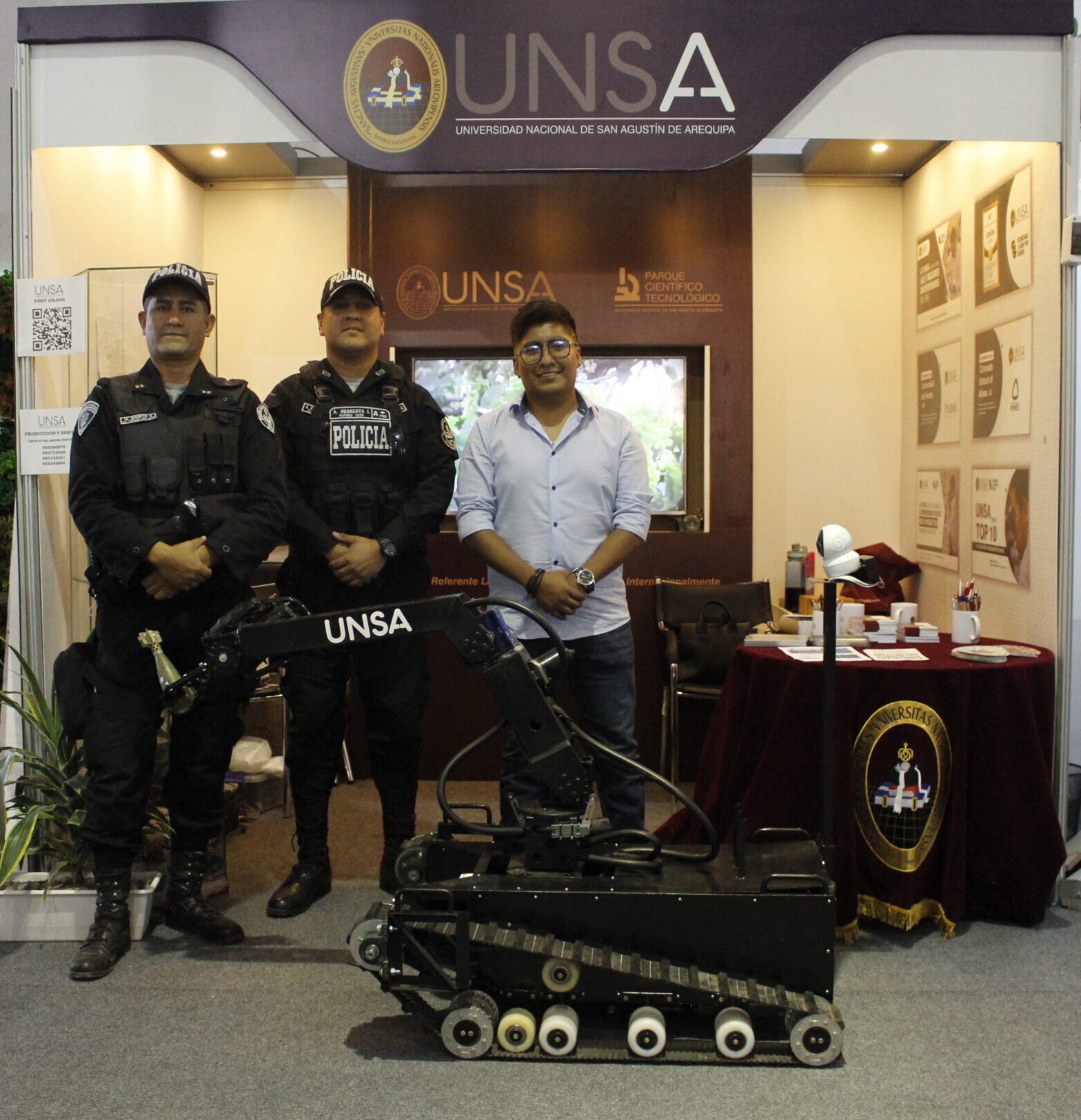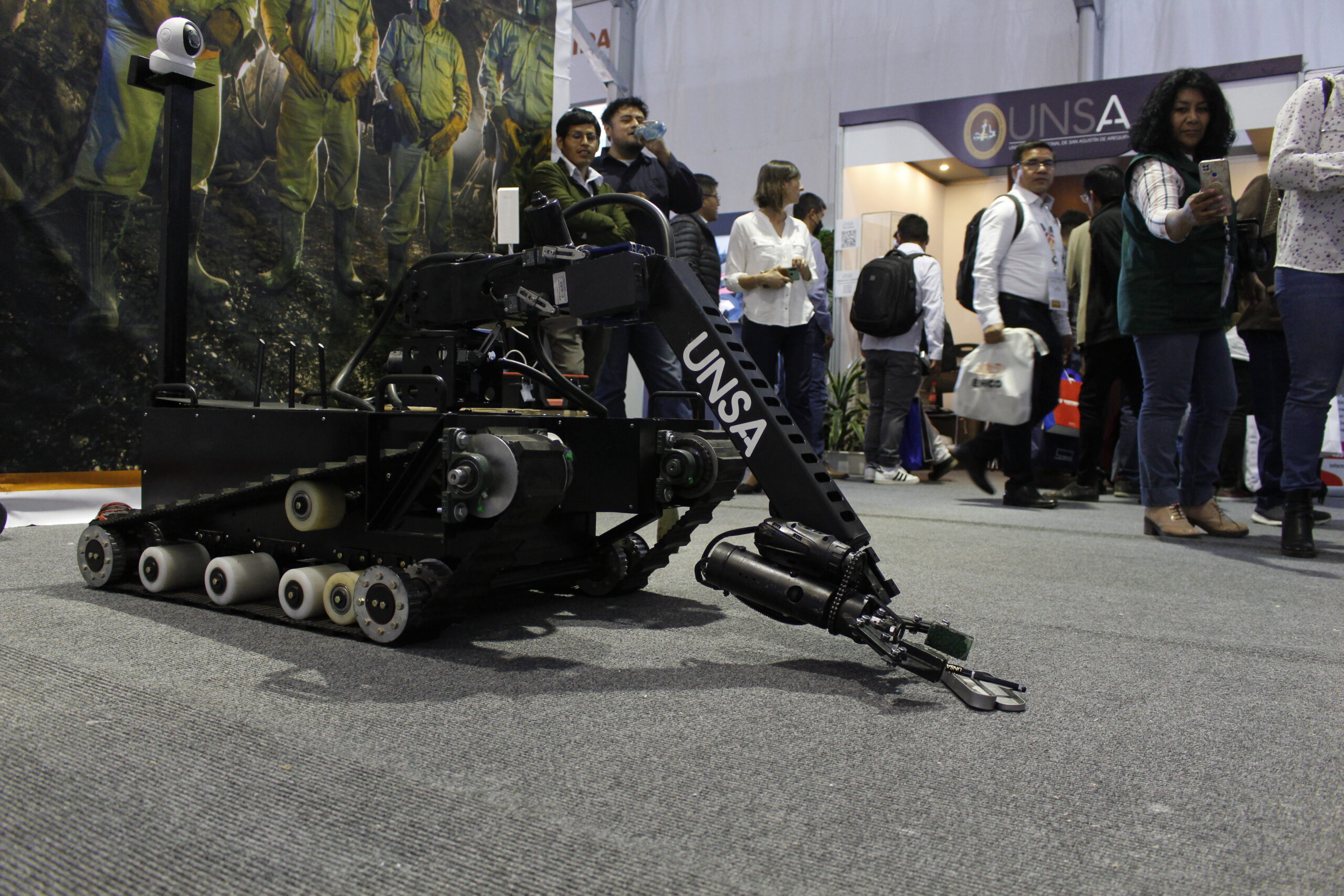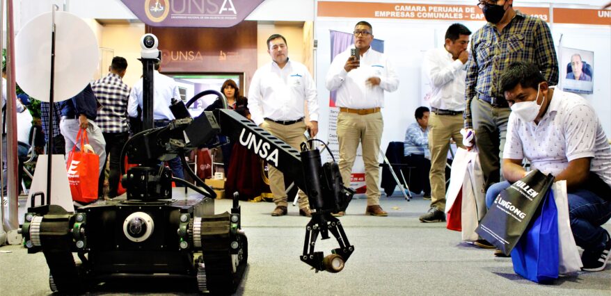 El robot desactivador de explosivos diseñado por investigadores de la Universidad Nacional de San Agustín de Arequipa, fue visto por el público asistente al PERUMIN 35 Convención Minera. El prototipo desarrollado por profesionales agustinos tiene la finalidad de manipular artefactos explosivos de diversos tipos y es manejado a distancia.