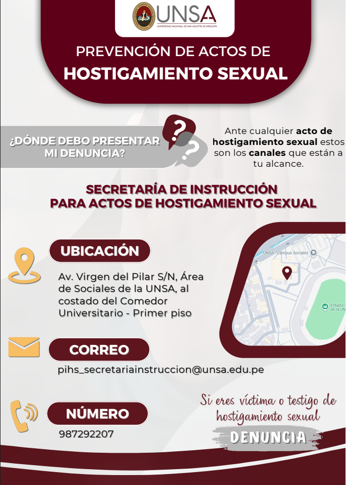 Para consultas o presentación de denuncias, la Secretaría de Instrucción atiende en la Av. Virgen del Pilar s/n, Área de Sociales de la UNSA, al costado del Comedor Universitario, y mantiene habilitado el correo pihs_secretariainstruccion@unsa.edu.pe