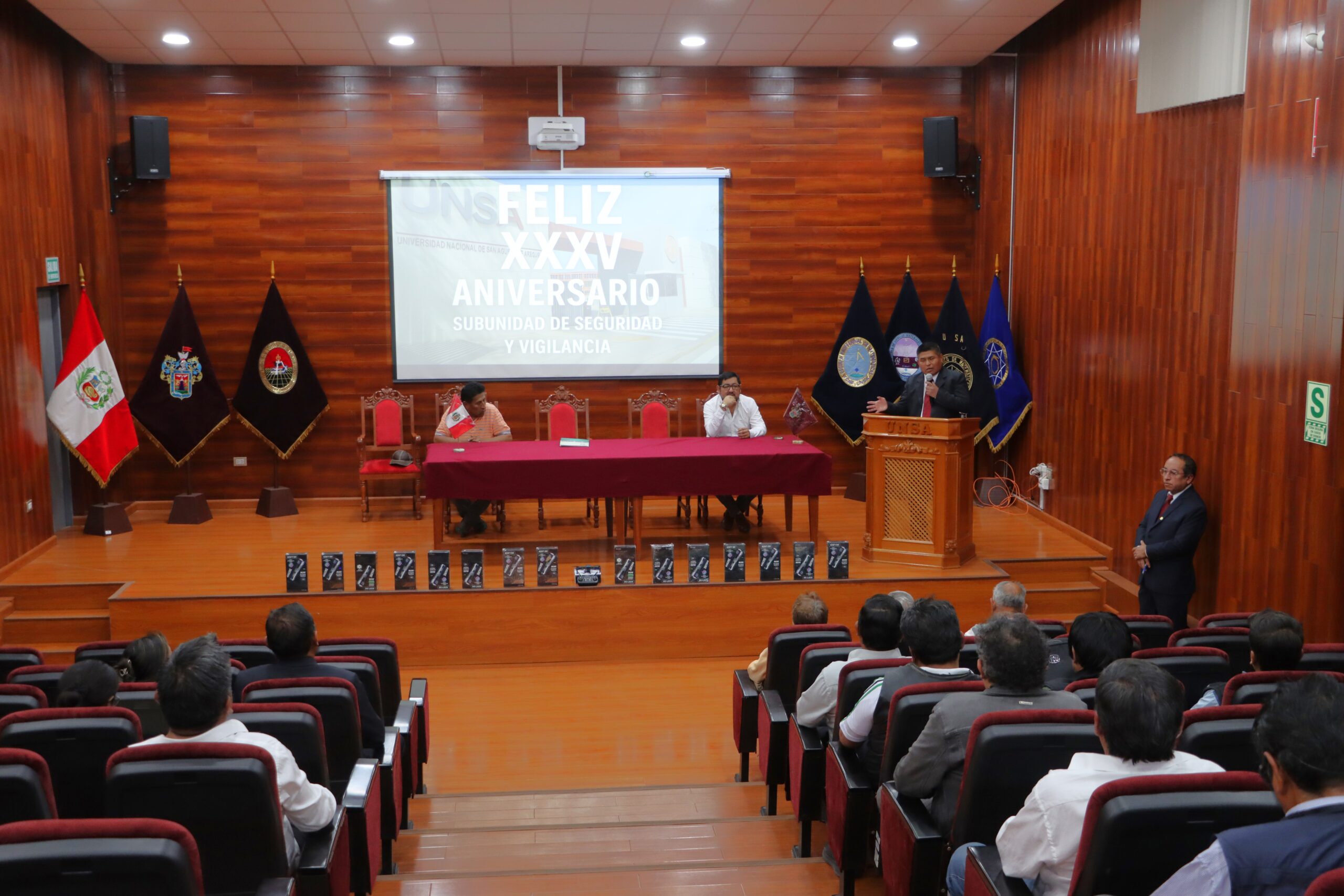 Con ceremonia protocolar y la adquisición de nuevo equipamiento, la Sub Unidad de Seguridad y Vigilancia celebró su 35 aniversario en el auditorio de la Escuela Profesional de Matemáticas.