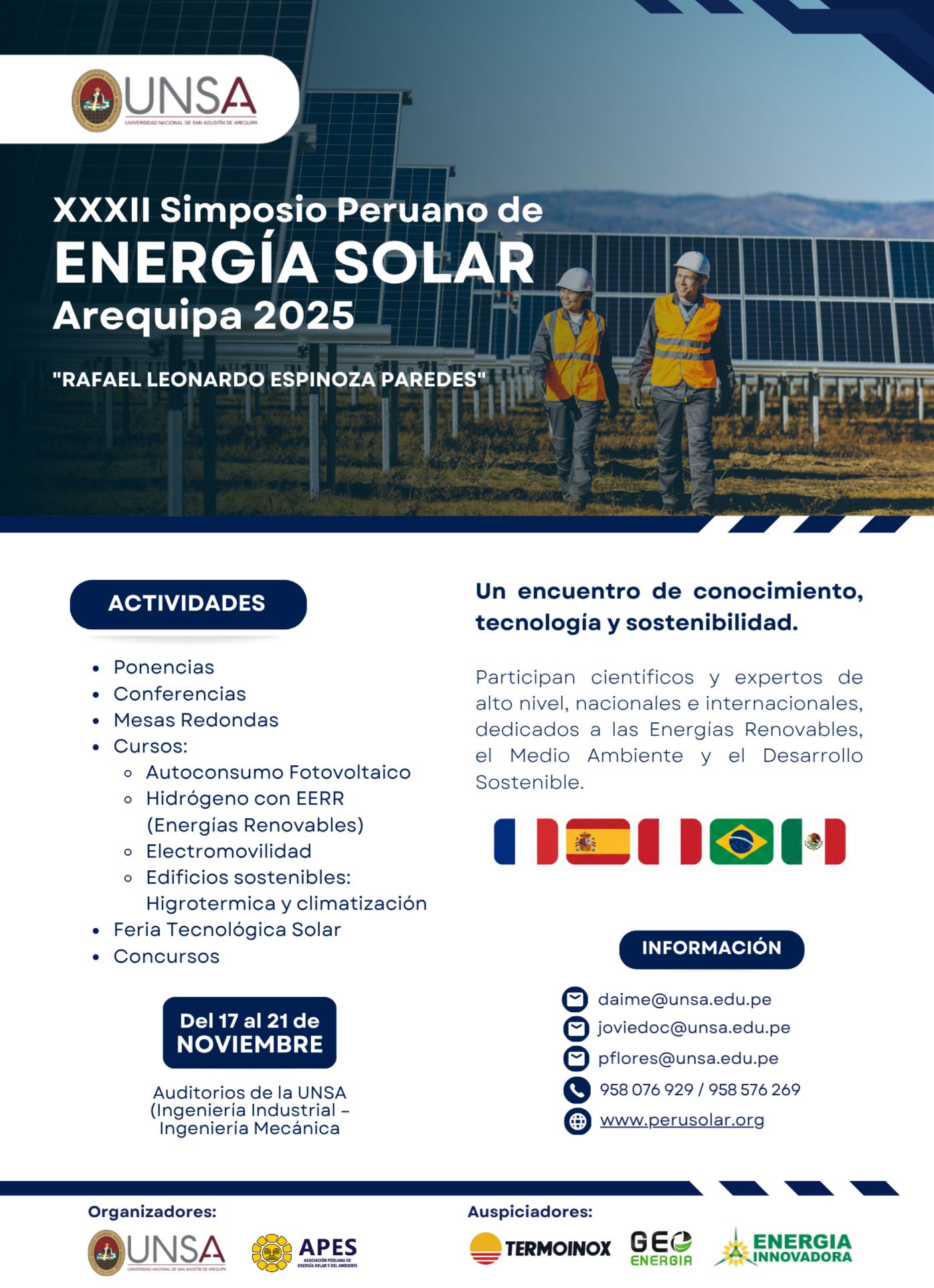El XXXII Simposio Peruano de Energía Solar (SPES), a celebrarse en Arequipa, del 17 al 21 de noviembre de 2025, se perfila como un evento crucial para el avance de las energías renovables en la región. Coorganizado por la Universidad Nacional de San Agustín de Arequipa (UNSA) y la Asociación Peruana de Energía Solar y del Ambiente (APES), este simposio promete ser un punto de encuentro clave para expertos, investigadores y líderes del sector.