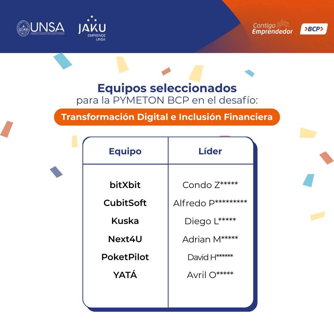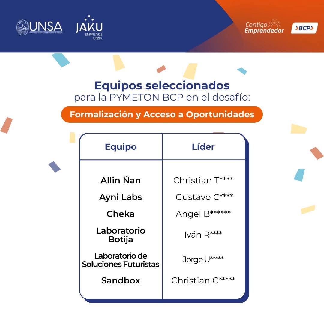 La competencia, que se llevará a cabo el viernes 5, sábado 6 y martes 9 de septiembre en las instalaciones de Jaku Emprende UNSA, reunirá a los siguientes equipos: