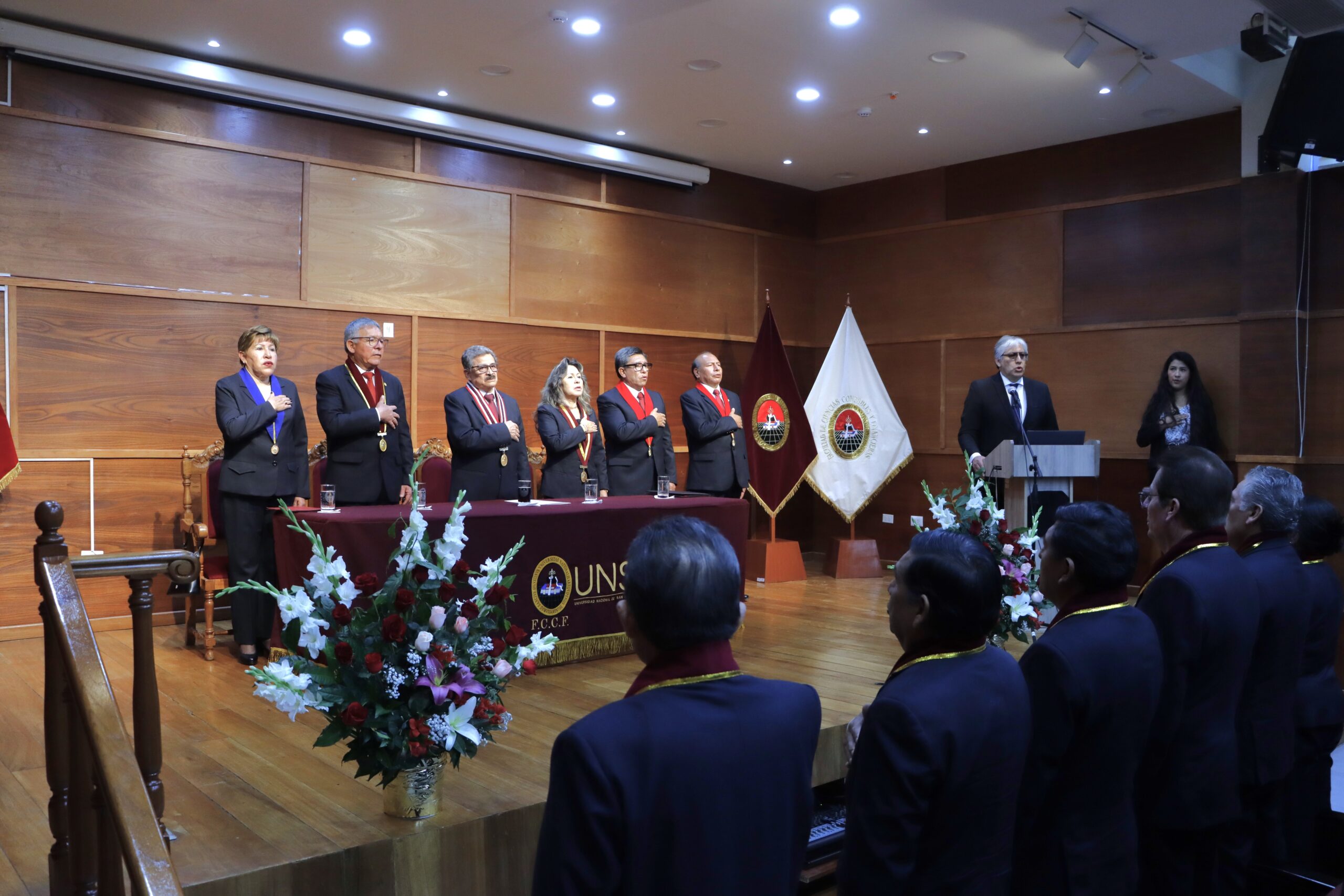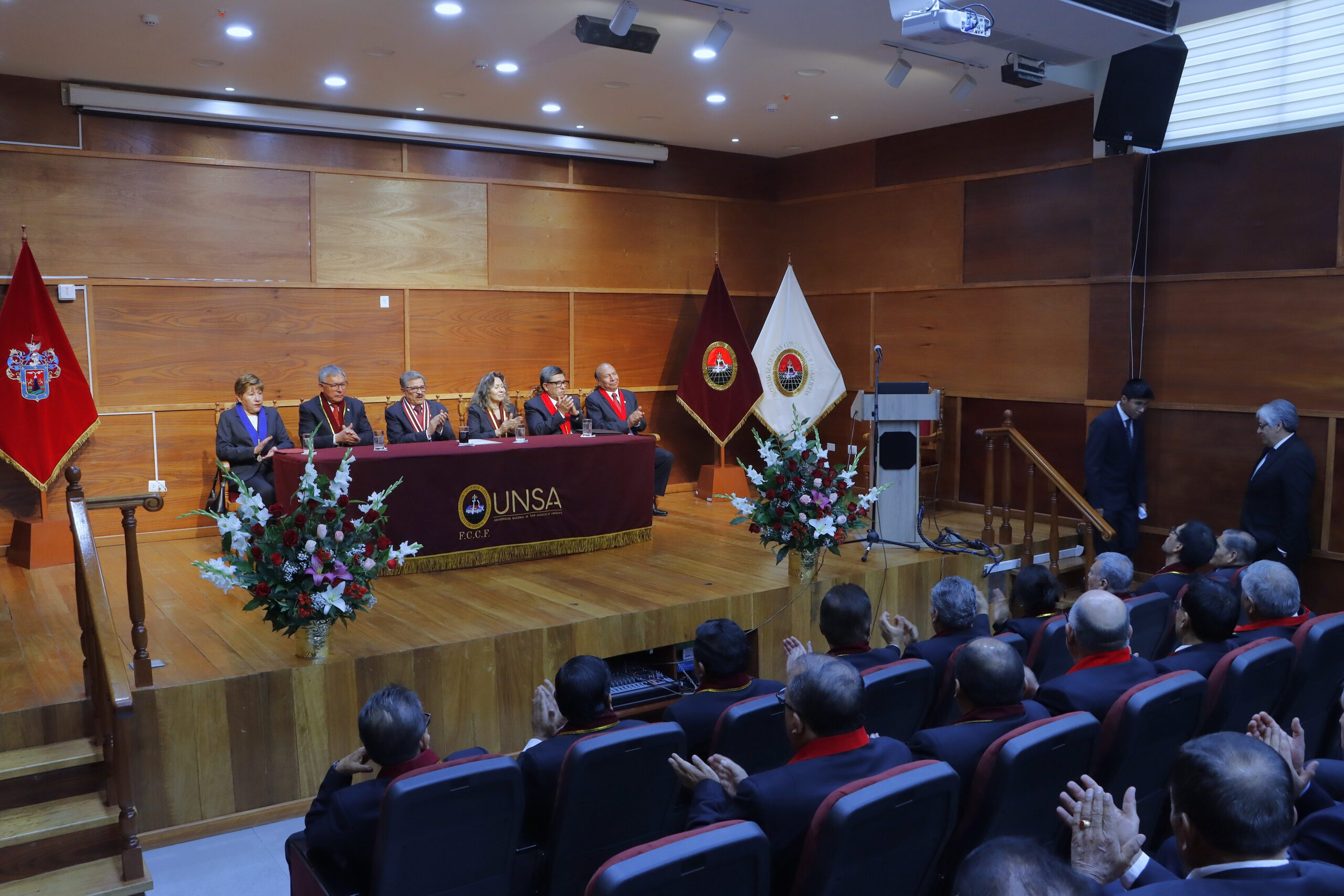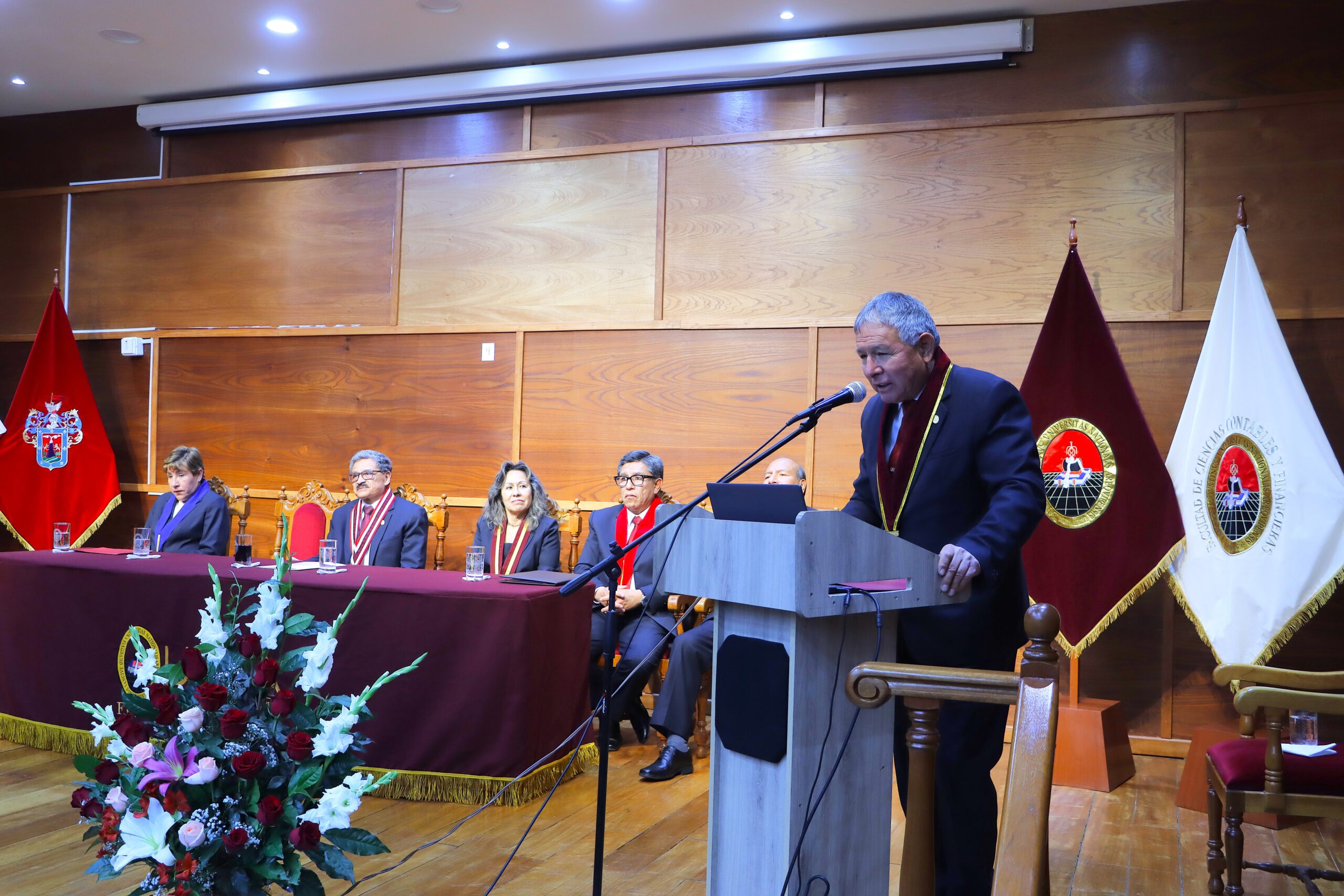 Participaron en la mesa de honor la secretaria general, Dra. Ruth Maritza Chirinos Lazo; la secretaria académica, Mgtr, Mirta Diaz Gonzales, quien dio lectura del acta de fundación de la Facultad; y el Dr. Jesús Hinojosa Ramos. También dio palabras el representante estudiantil, Edwar Chambi Condori.