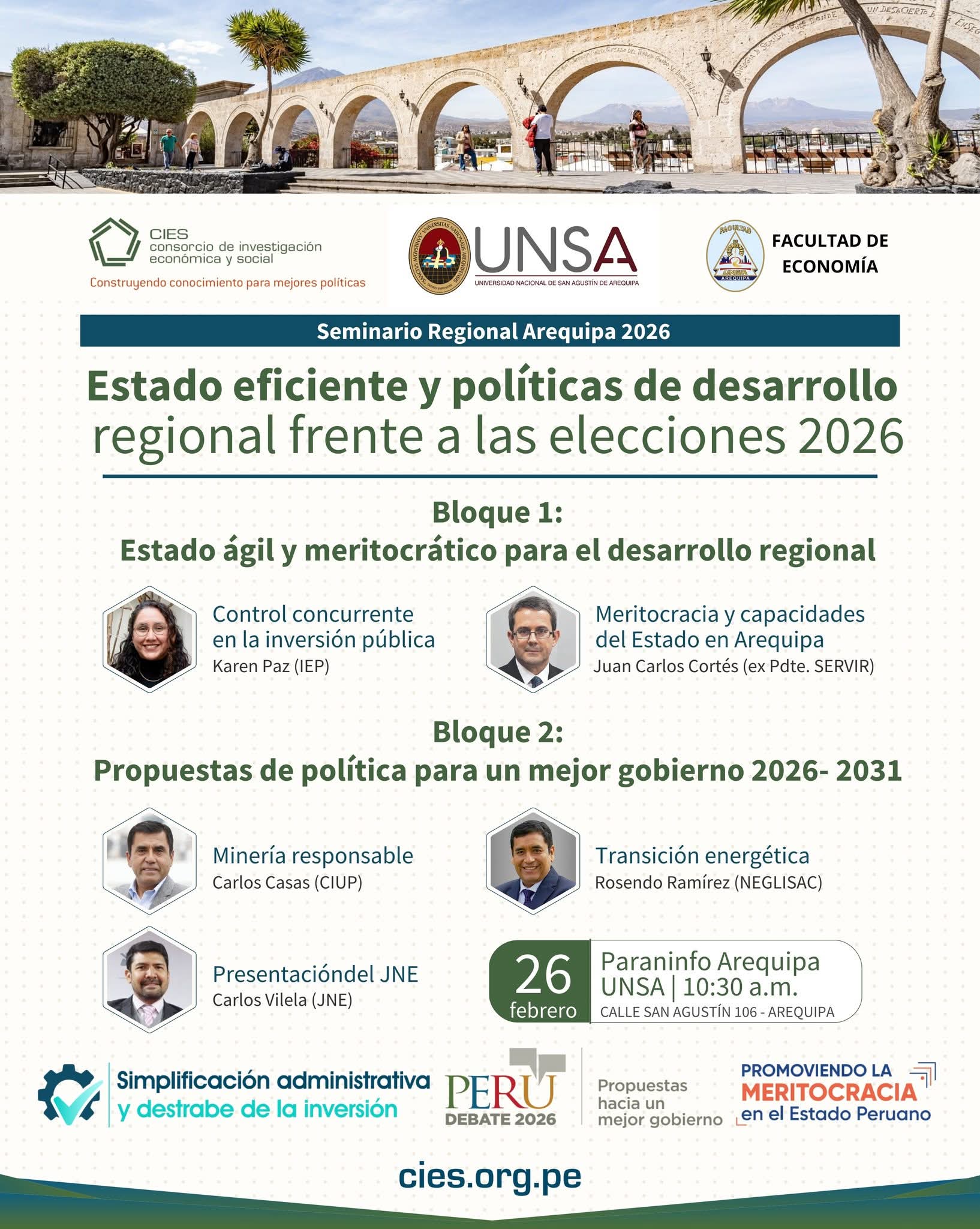 El evento forma parte de las iniciativas que buscan promover la meritocracia y construir un mejor gobierno en el Estado peruano, abordando también temas como la simplificación administrativa y el destrabe de la inversión. La Facultad de Economía de la UNSA destaca que este seminario es una oportunidad para conectar actores regionales y nacionales, generando propuestas concretas que contribuyan al desarrollo sostenible de Arequipa y el país frente al ciclo electoral próximo.