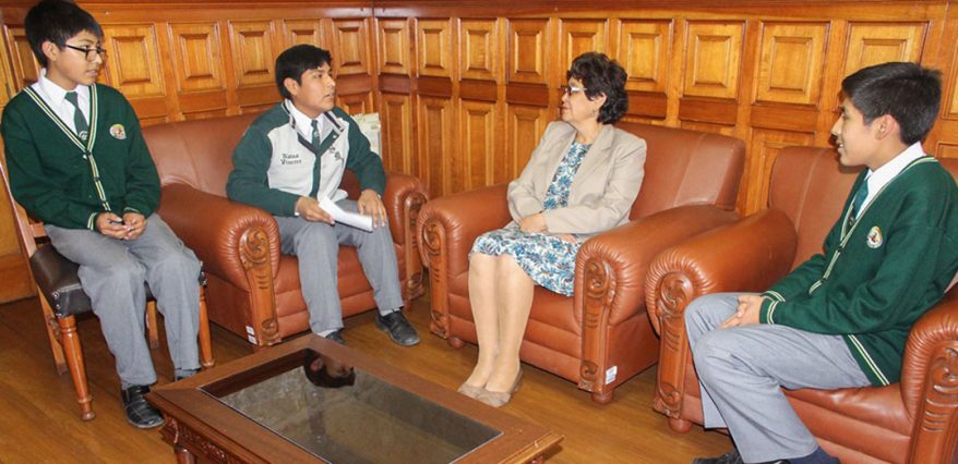 Luchar contra la corrupción es una de las líneas de gestión que la UNSA está siguiendo en todos sus niveles académicos y administrativos; así lo dio a conocer la Vicerrectora Académica, Dra. Ana María Gutiérrez Valdivia, al recibir la visita de escolares de la II.EE. San Martín de Porres, quienes le entregaron formalmente una carta donde promueven su proyecto “Educación Anticorrupción”.