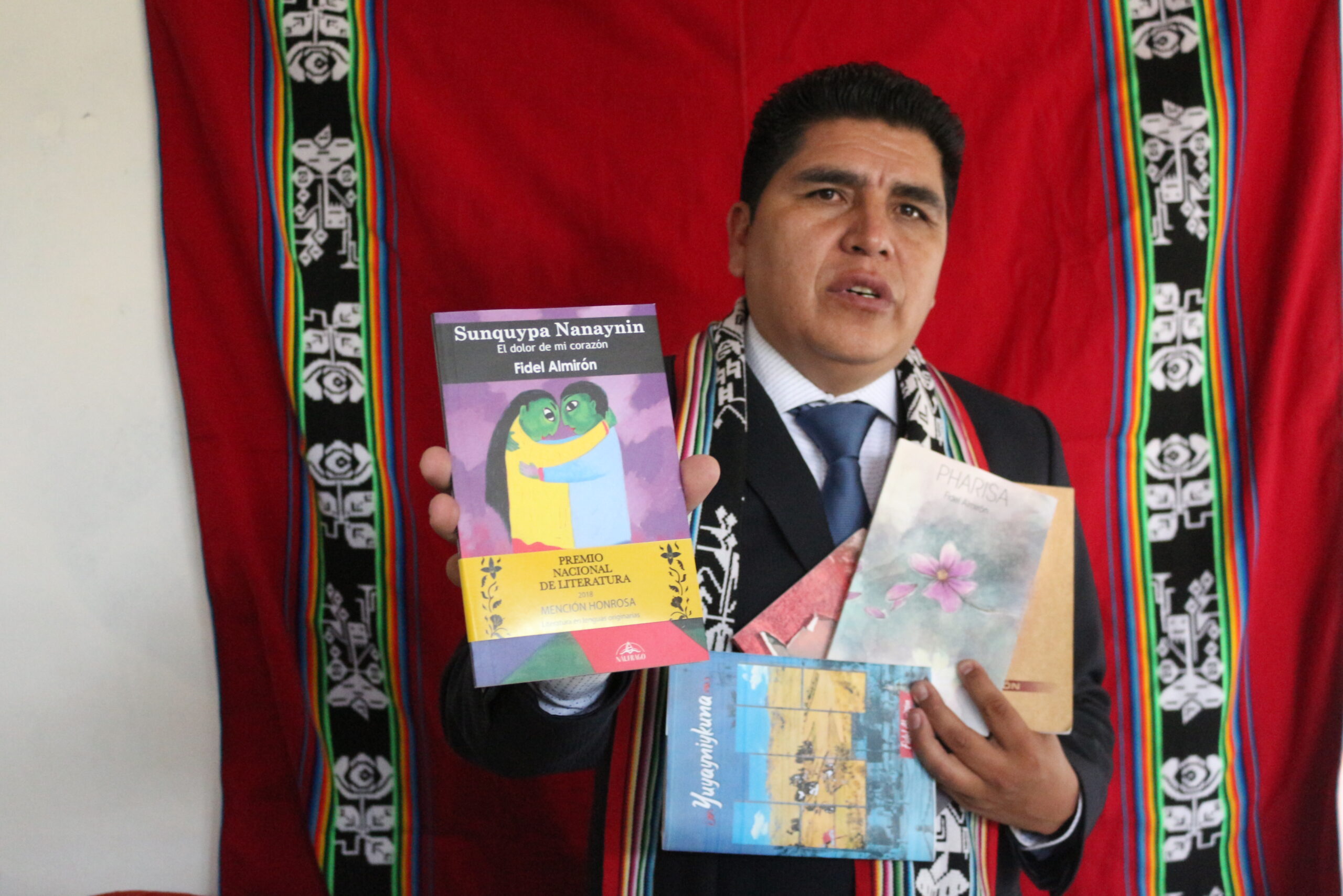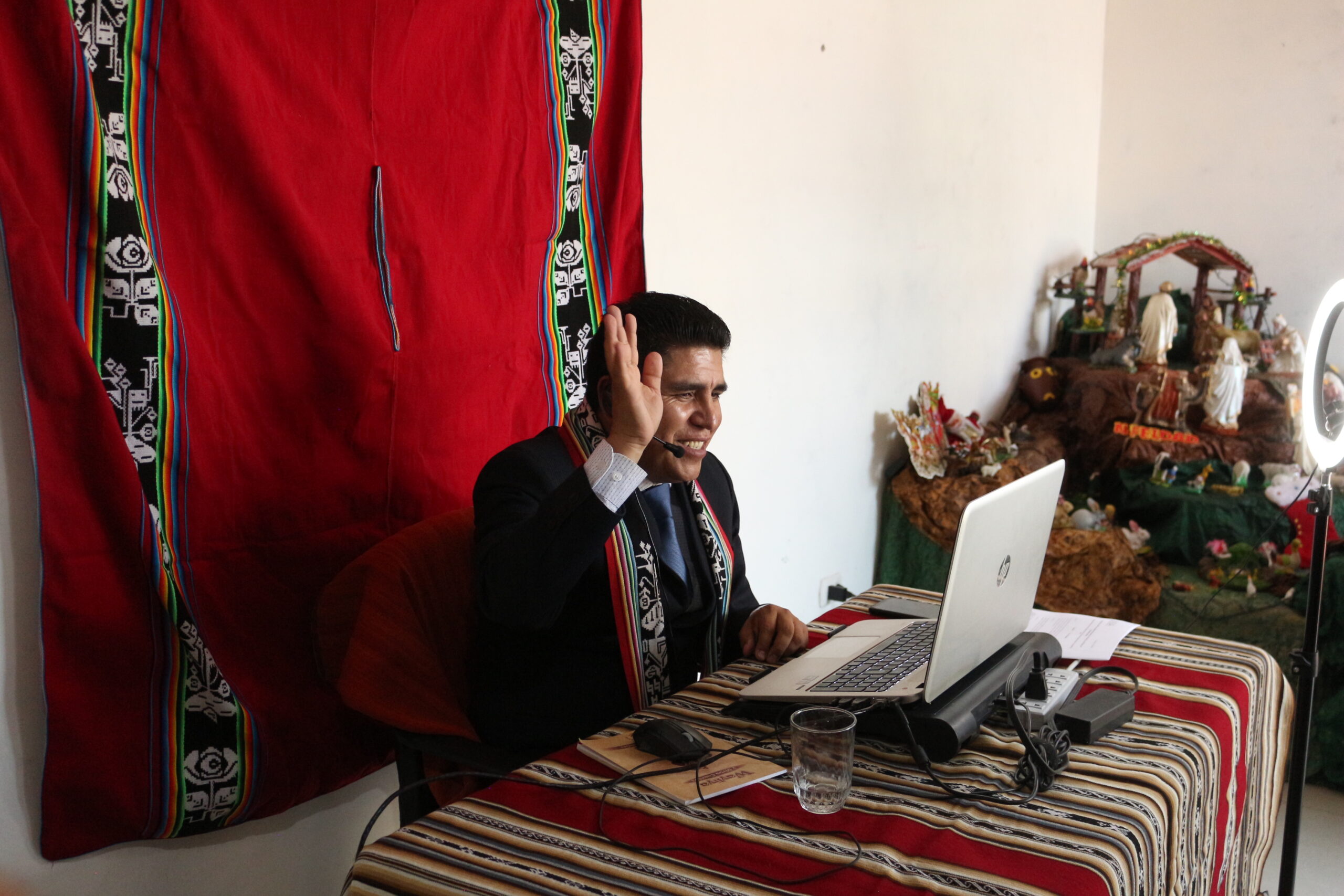 Fidel Almirón colocó su escritorio en la sala de su casa y lo cubrió con una lliclla, un poncho rojo con bordados preincas colgaba en su pared para que le sirviera de fondo.