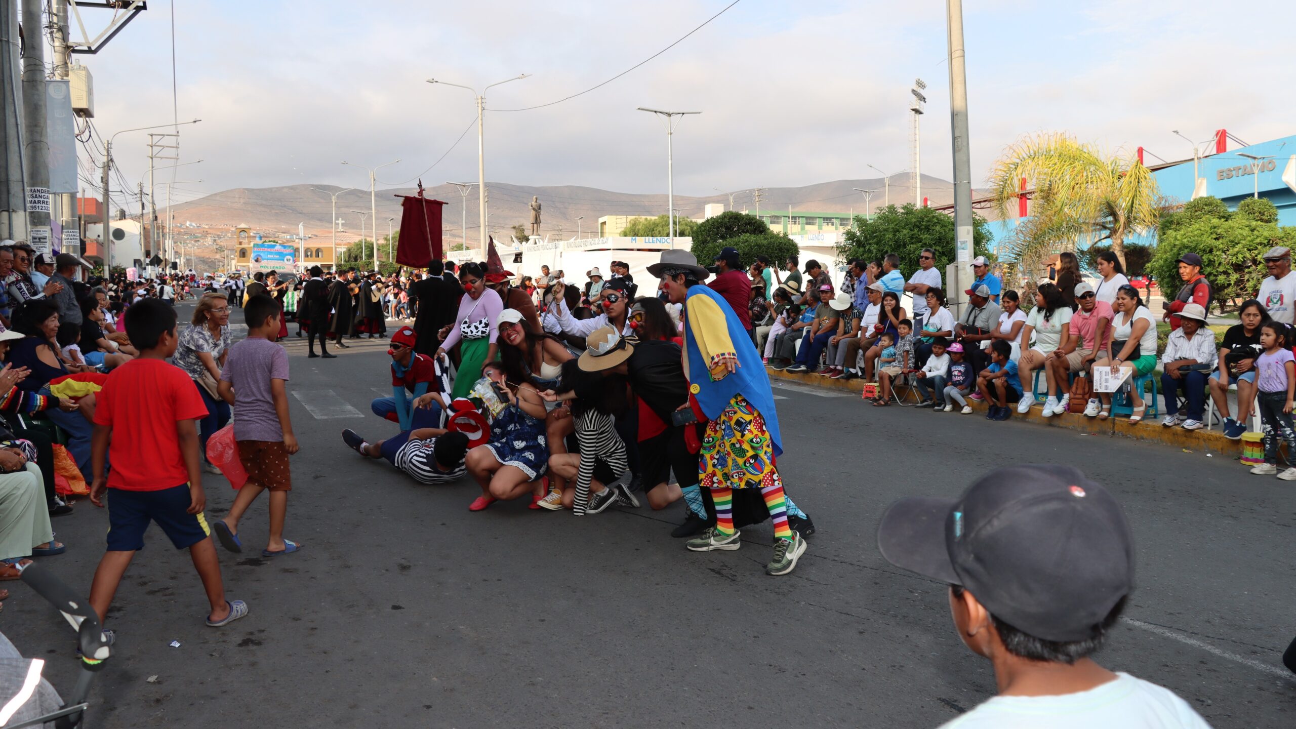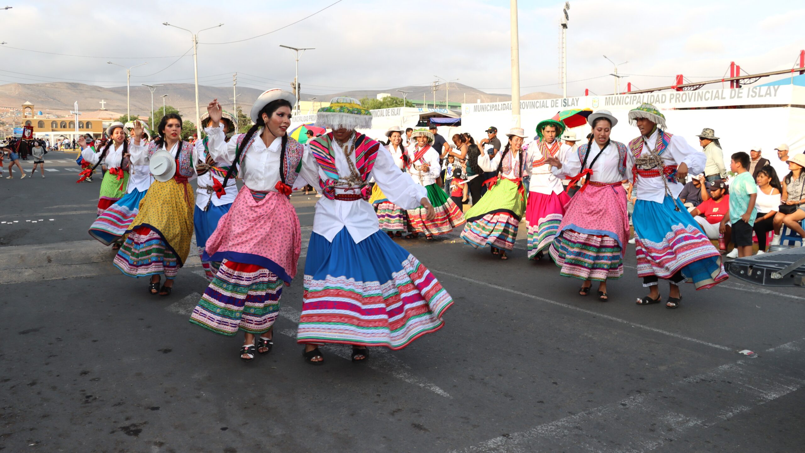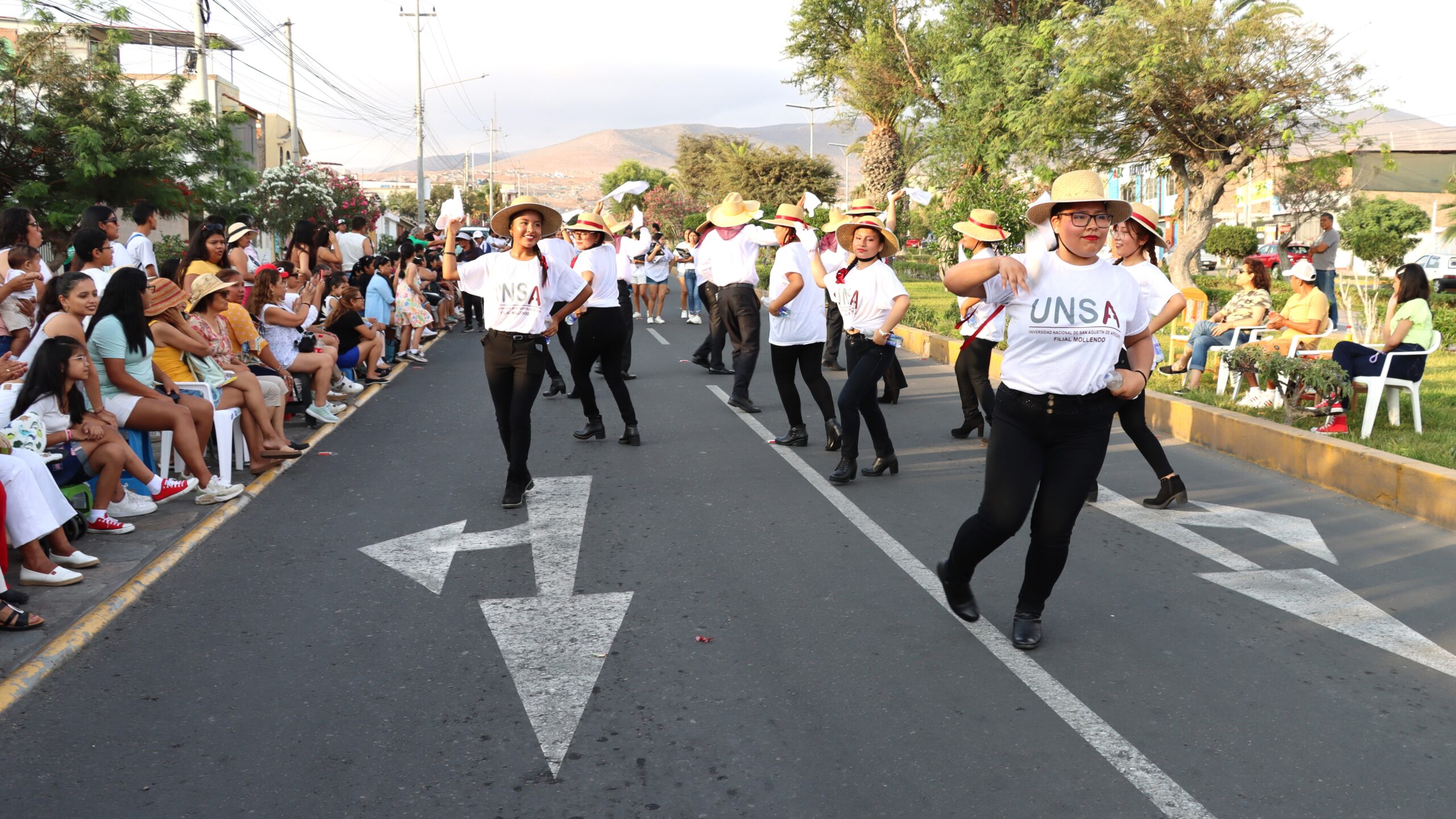 Asimismo, los estudiantes de Administración de la Filial, con pañuelos en mano, presentaron una serie de danzas arequipeñas, como el Carnaval, la Benita y otras pampeñas, para el disfrute de los mollendinos que se instalaron en los costados de las arterias.