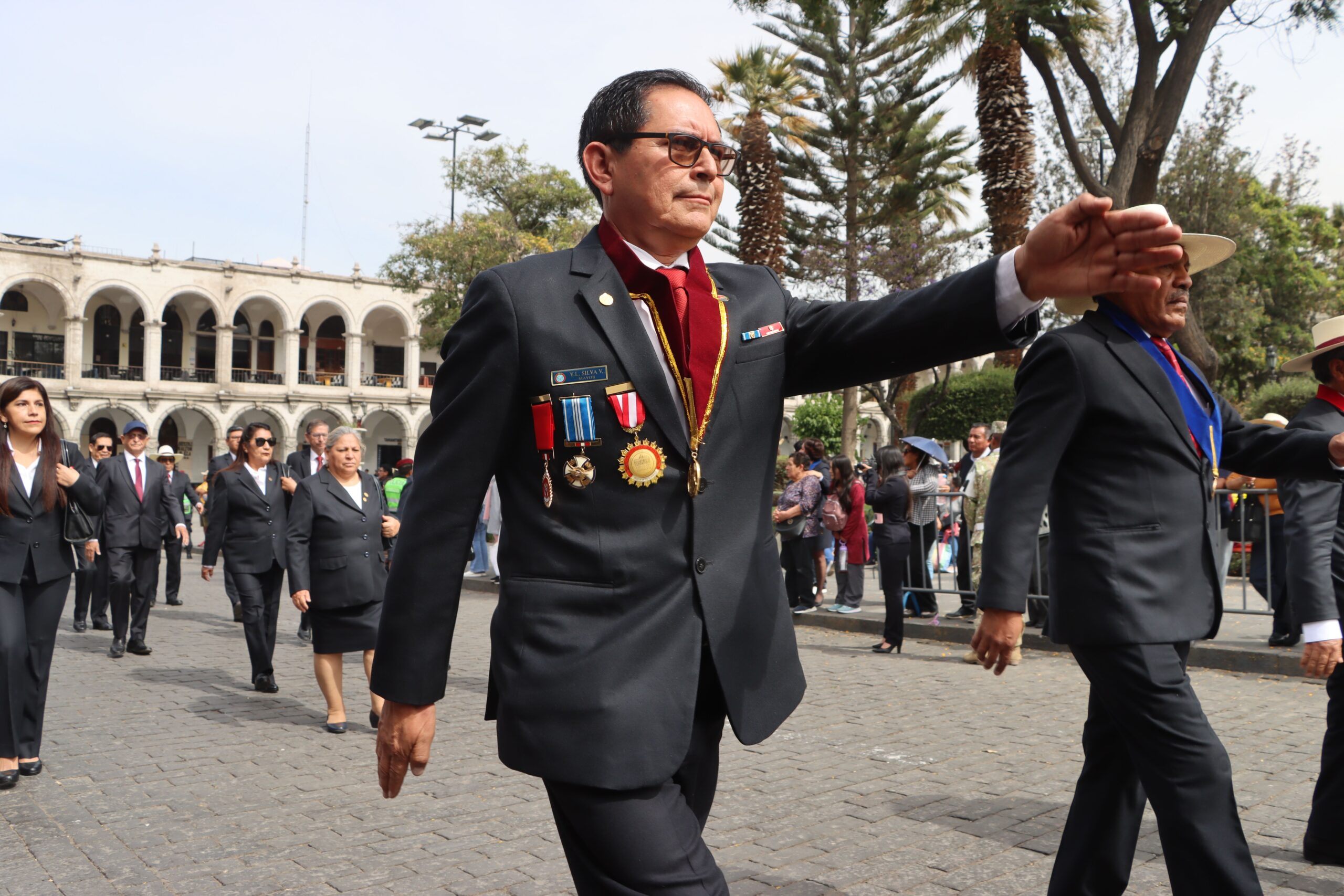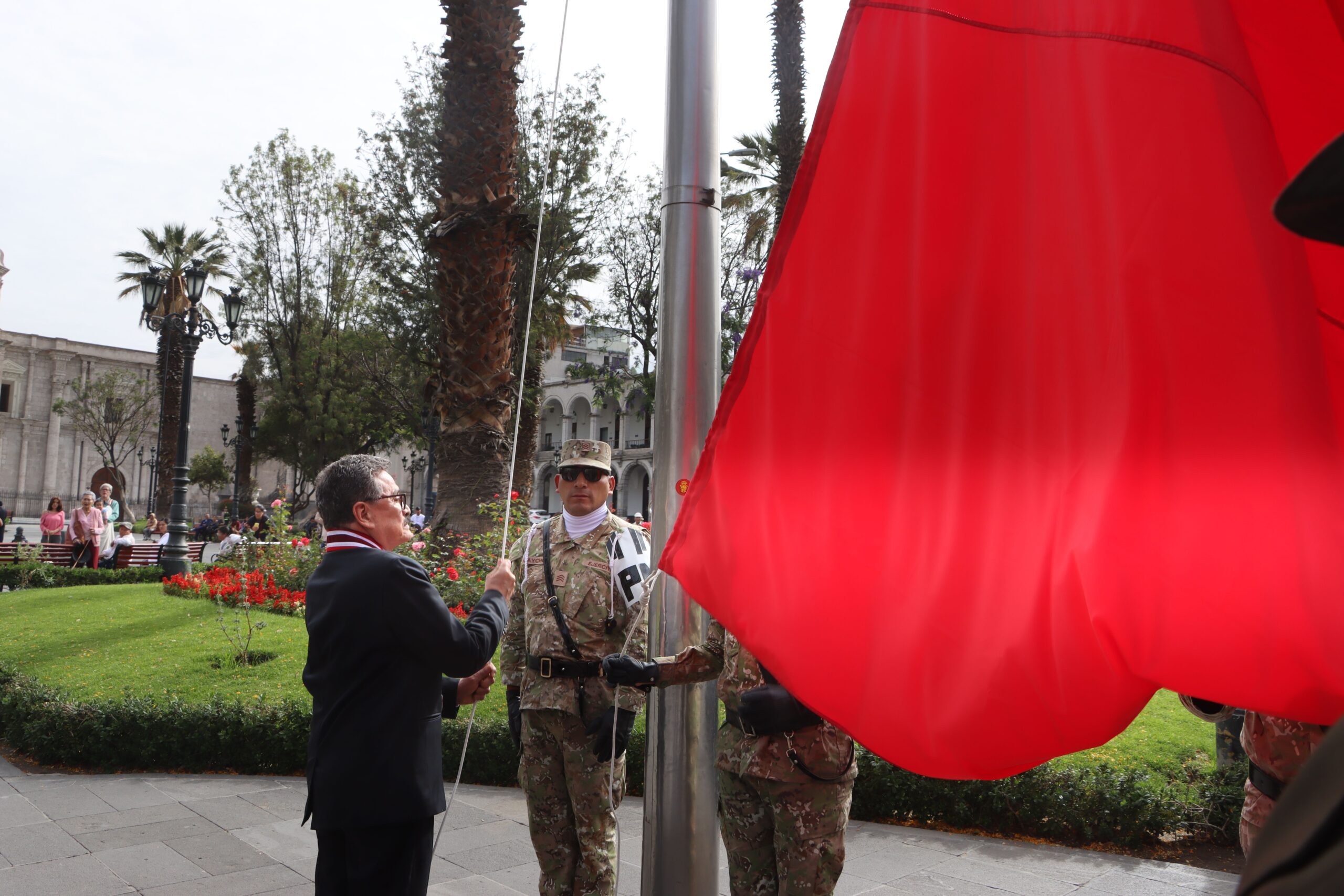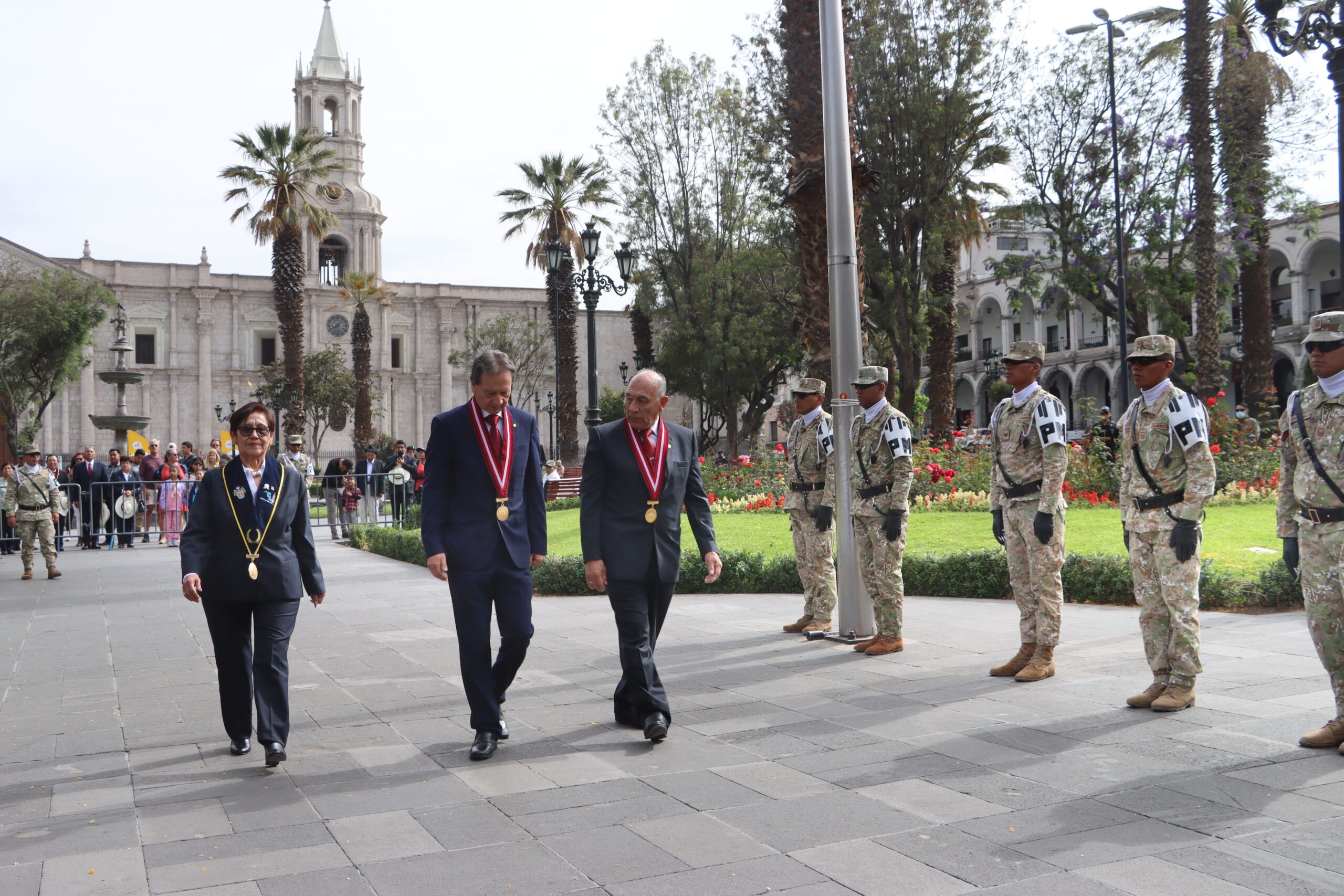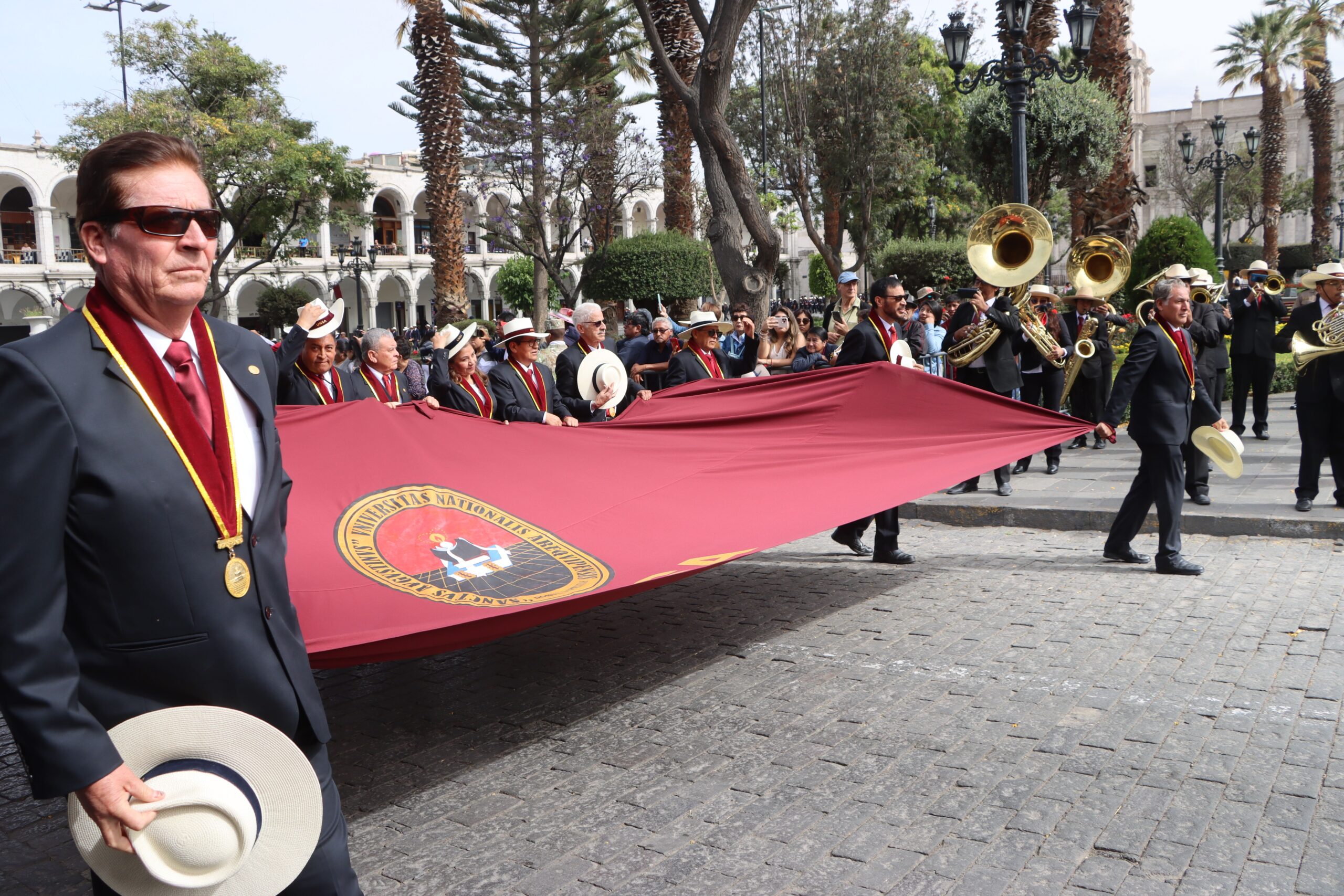 La jornada se inició con la solemnidad que amerita la ocasión. A las 8 de la mañana, el Dr. Hugo Rojas Flores, rector de la UNSA, izó el Pabellón Nacional, un gesto cargado de simbolismo patrio. Los vicerrectores, doctores Luis Cuadros Paz y Henry Polanco Cornejo, hicieron lo propio con la bandera de Arequipa, en un reconocimiento exclusivo a la universidad por su destacada trayectoria y legado.