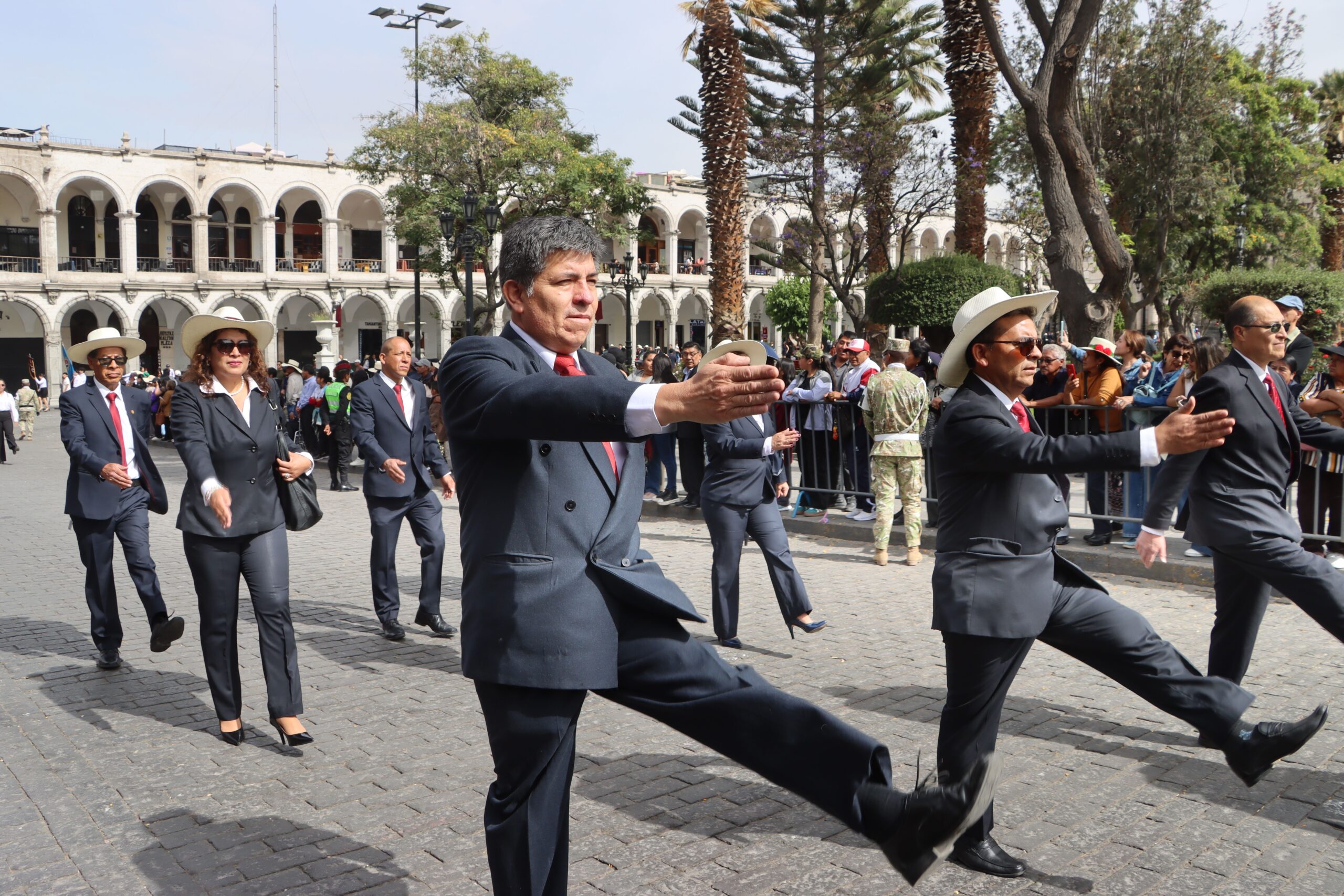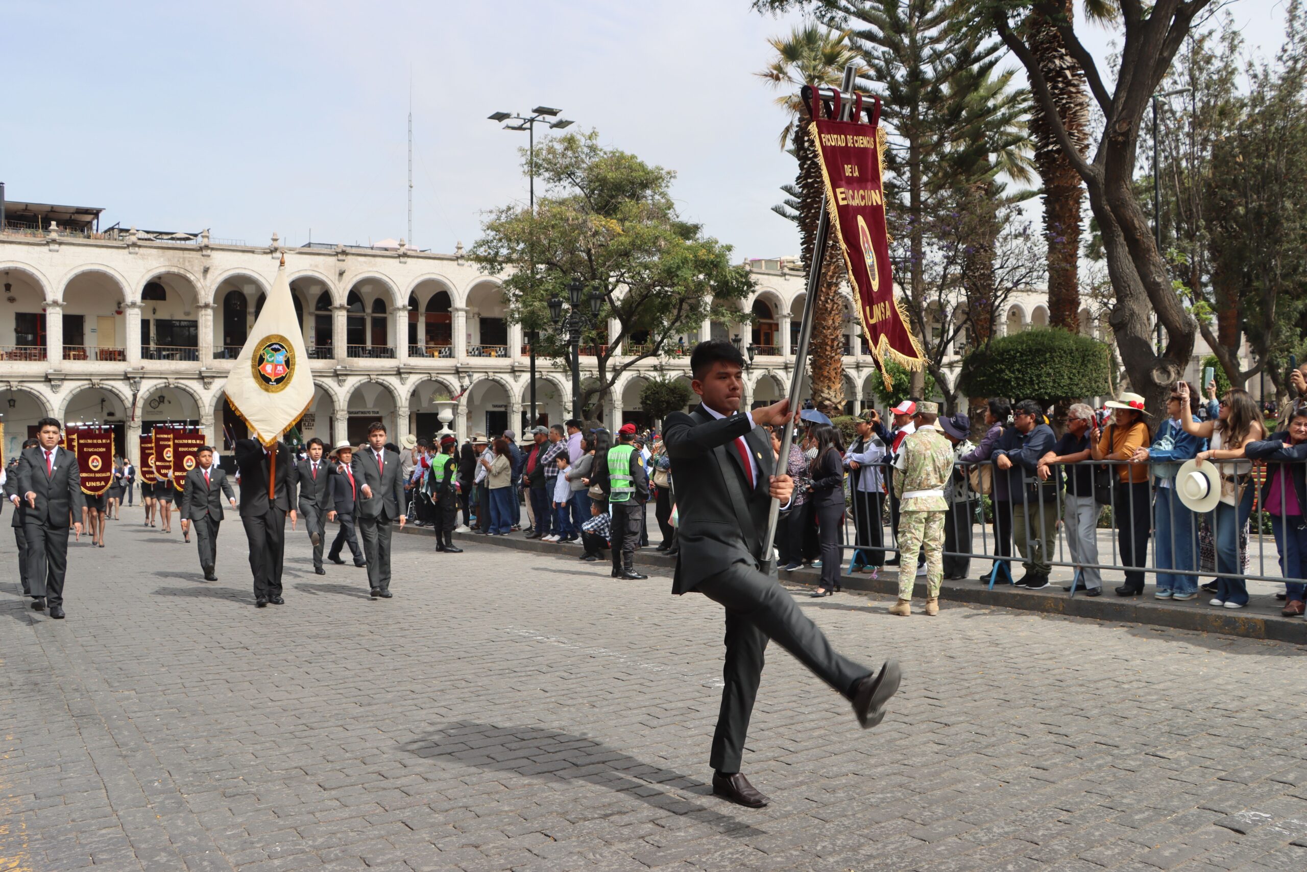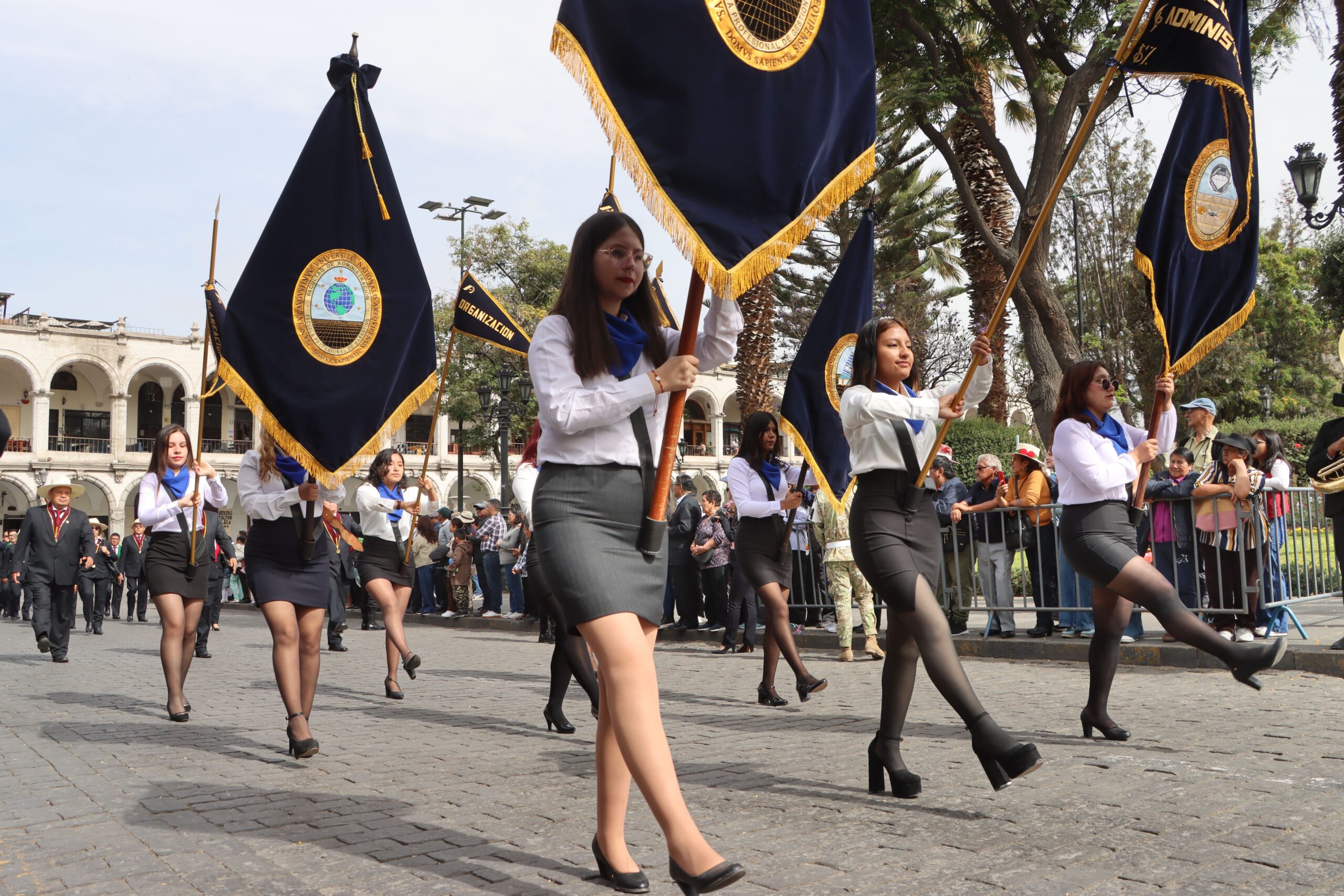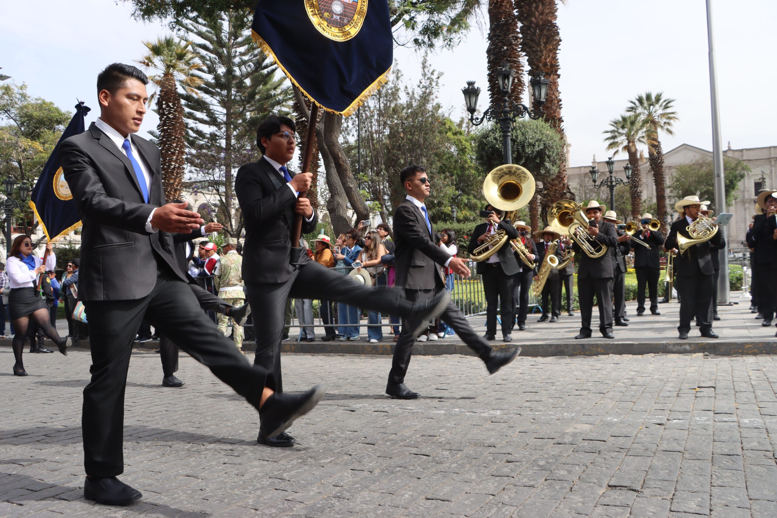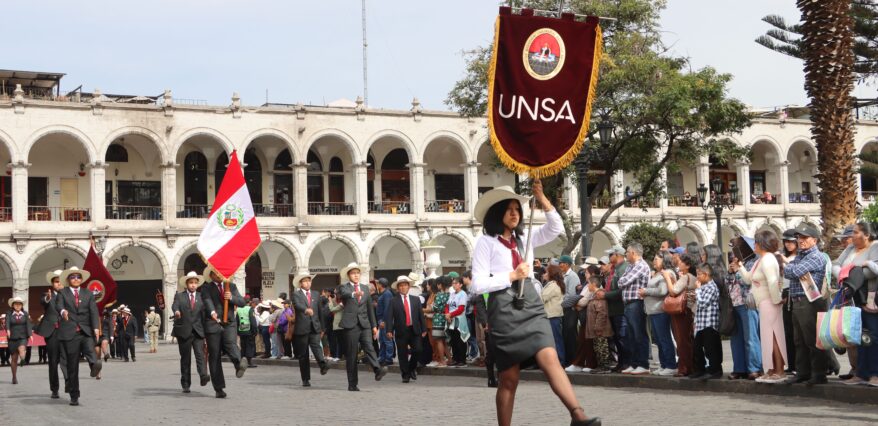 El desfile, un crisol de tradición y fervor universitario, comenzó con el resonar de la banda de la UNSA, cuyas melodías patrióticas marcaron el paso marcial de los participantes. La estola universitaria, la escolta y el escoltín precedieron al Consejo Universitario, cuyos miembros portaban con orgullo la bandera de la institución.