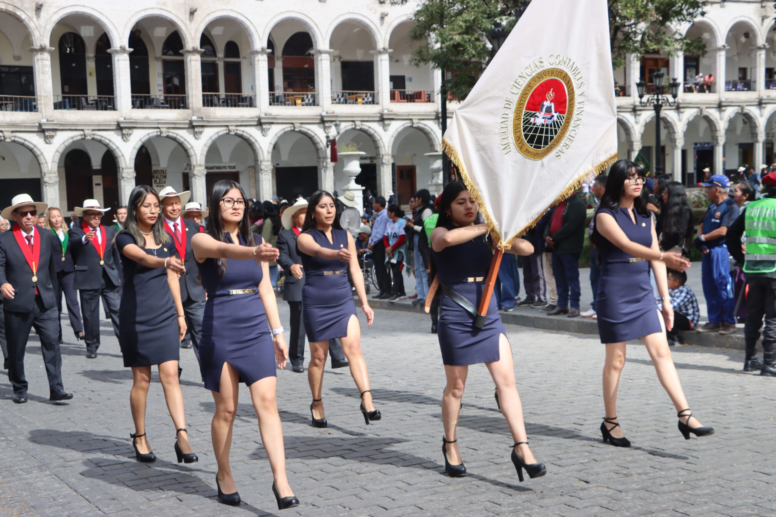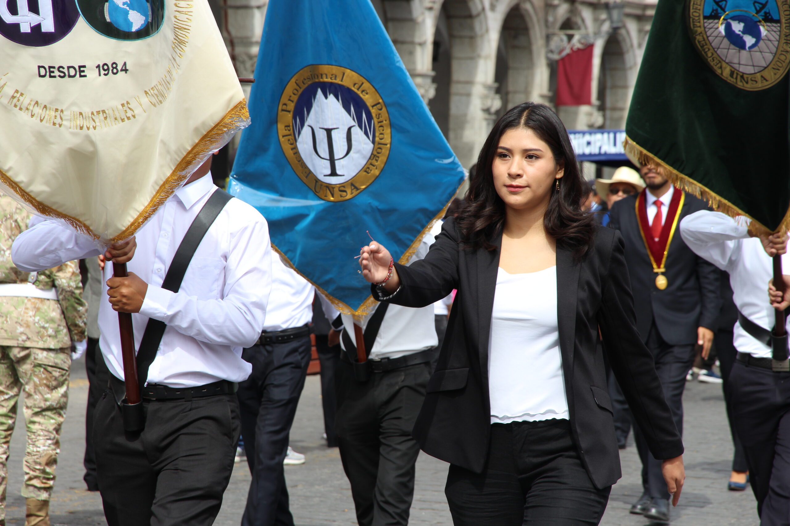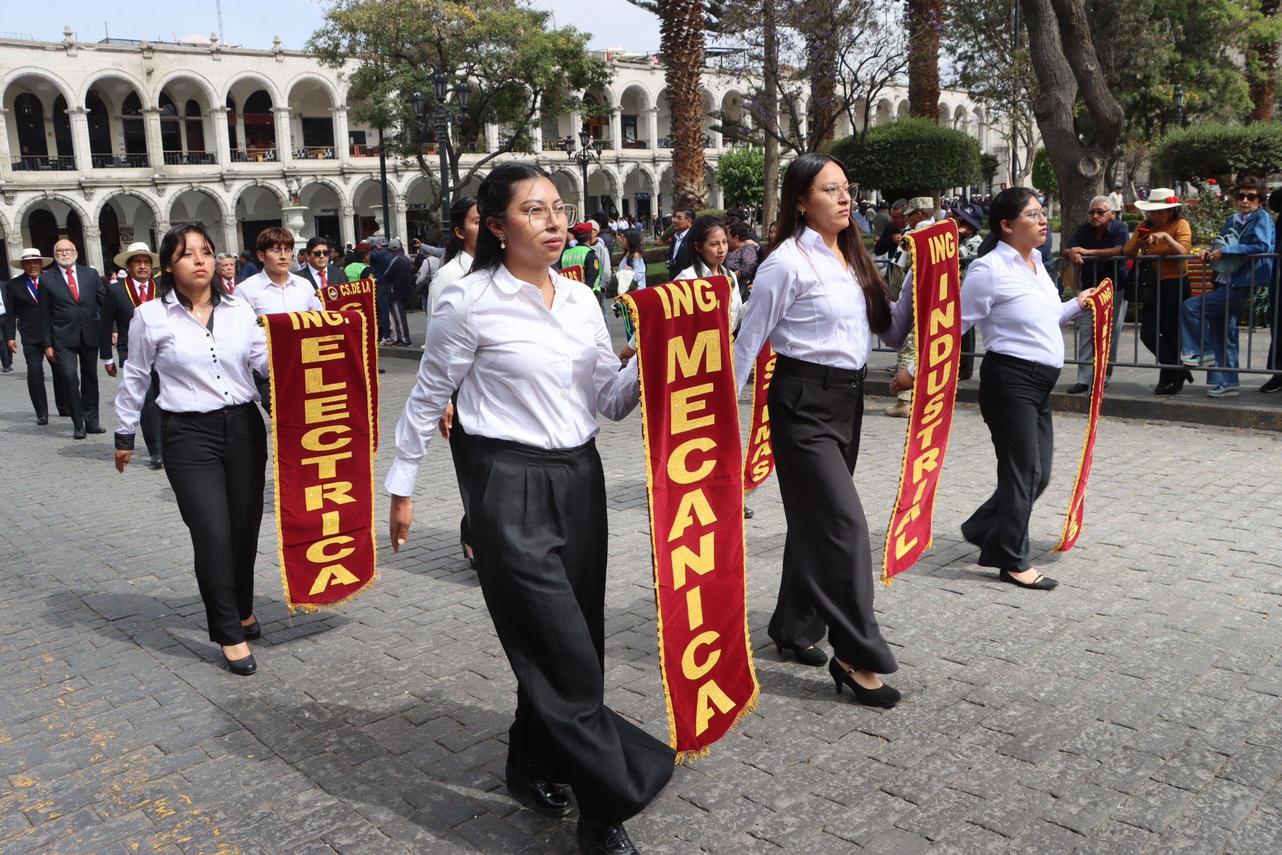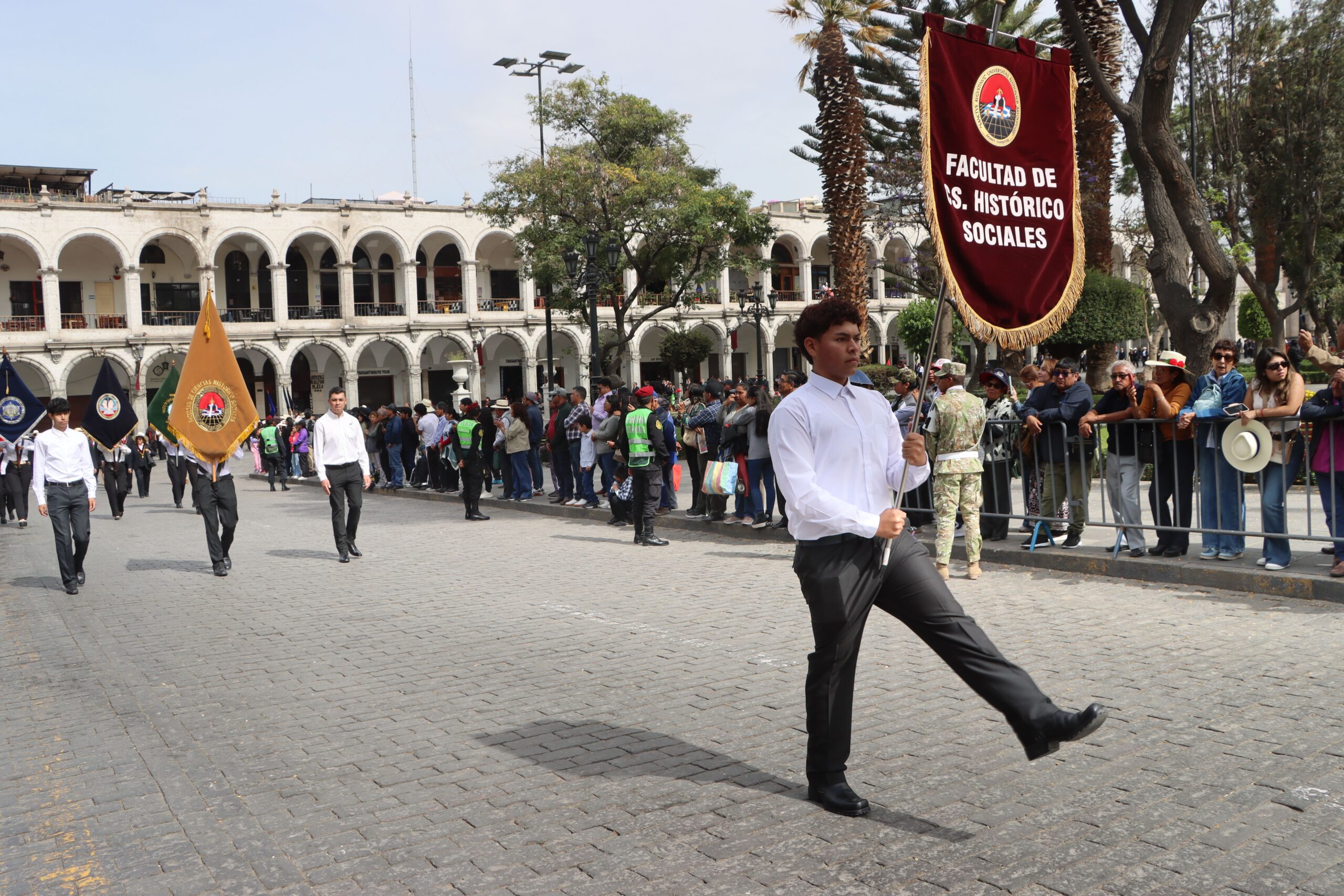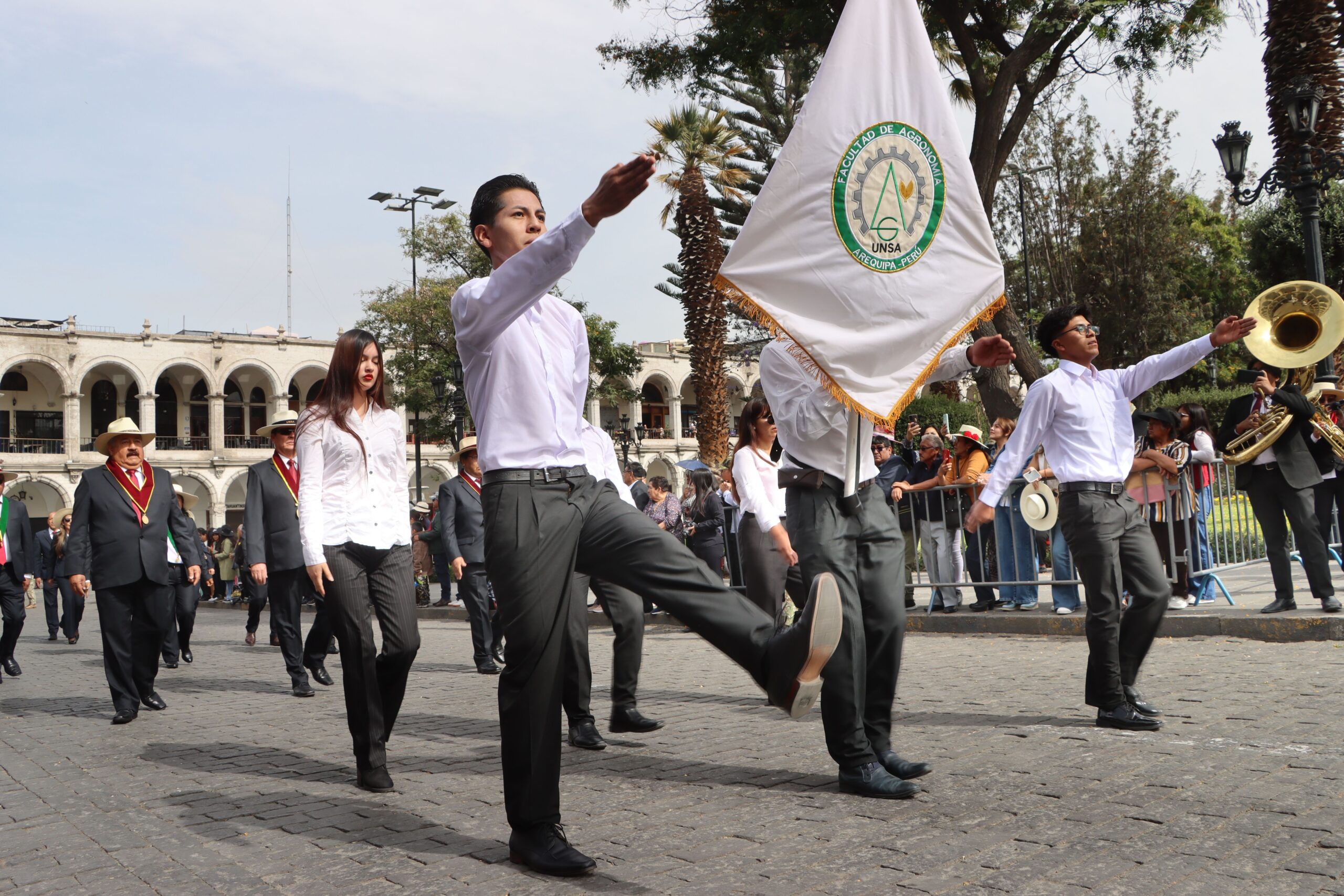Las delegaciones de las 18 facultades de la UNSA, con la participación de Administración; Agronomía; Arquitectura y Urbanismo; Ciencias Biológicas; Ciencias Contables y Financieras; Ciencias de la Educación; Ciencias Histórico Sociales; Ciencias Naturales y Formales; Facultad de Derecho; Economía; Enfermería; Filosofía y Humanidades; Geología, Geofísica y Minas; Ingeniería Civil; Ingeniería de Procesos; Ingeniería de Producción y Servicios; Facultad de Medicina; y la Facultad de Psicología Relaciones Industriales y Ciencias de la Comunicación, desfilaron con paso firme, representando la diversidad y la riqueza académica de la universidad. Cada facultad aportó su sello distintivo, mostrando la vitalidad y el dinamismo de la comunidad estudiantil.