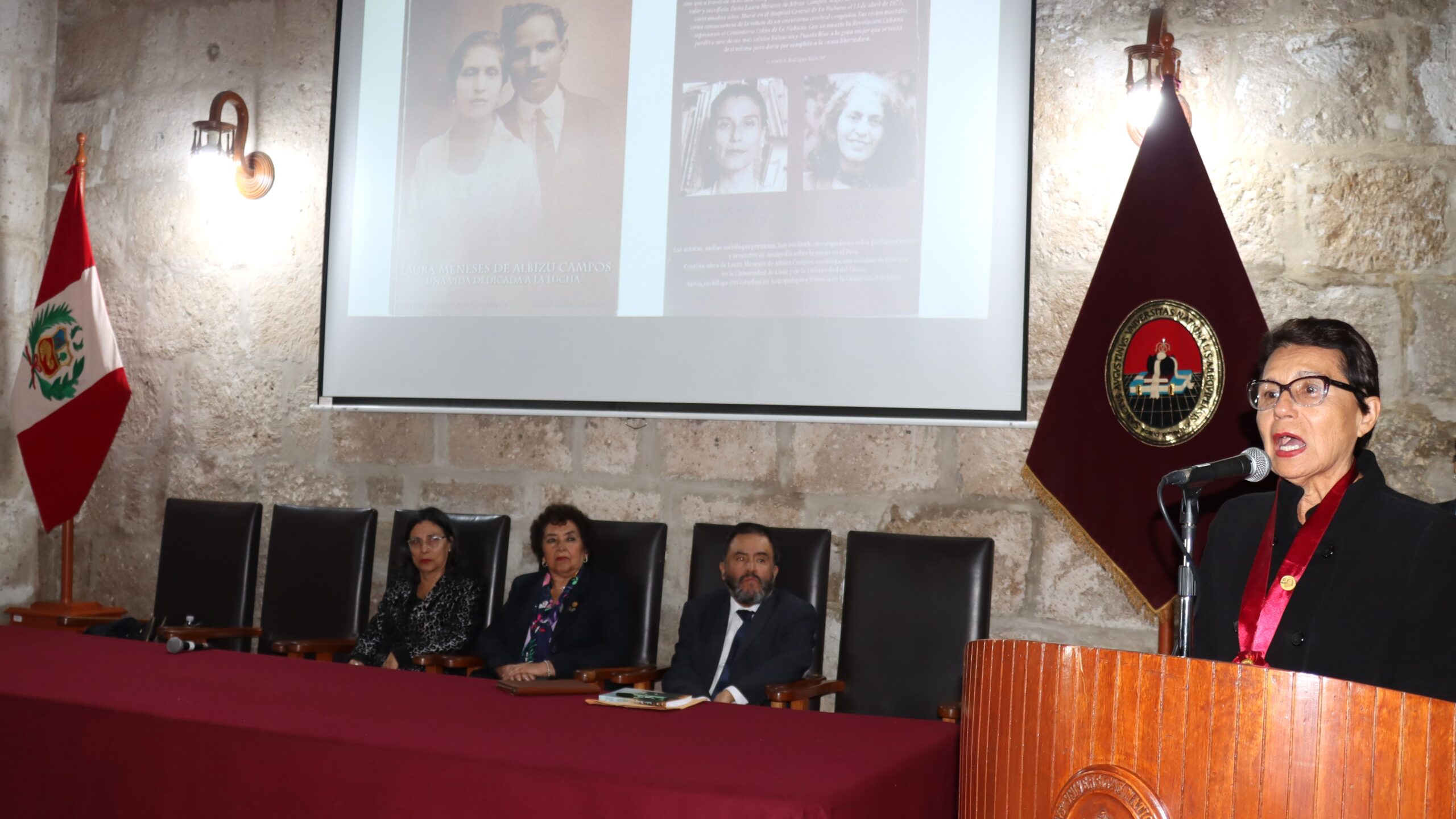 El acto protocolar contó con la participación de la Dra. Sonia Mercedes Neves Murillo, jefa de la Oficina de Responsabilidad Social Universitaria en representación de la casa agustina, las nietas de la ilustre arequipeña, Dra. Rosa Meneses Albizu Campos y Dra. Cristina Meneses Albizu Campos, así como el historiador arequipeño Dr. Mario Rommel Arce Espinoza.