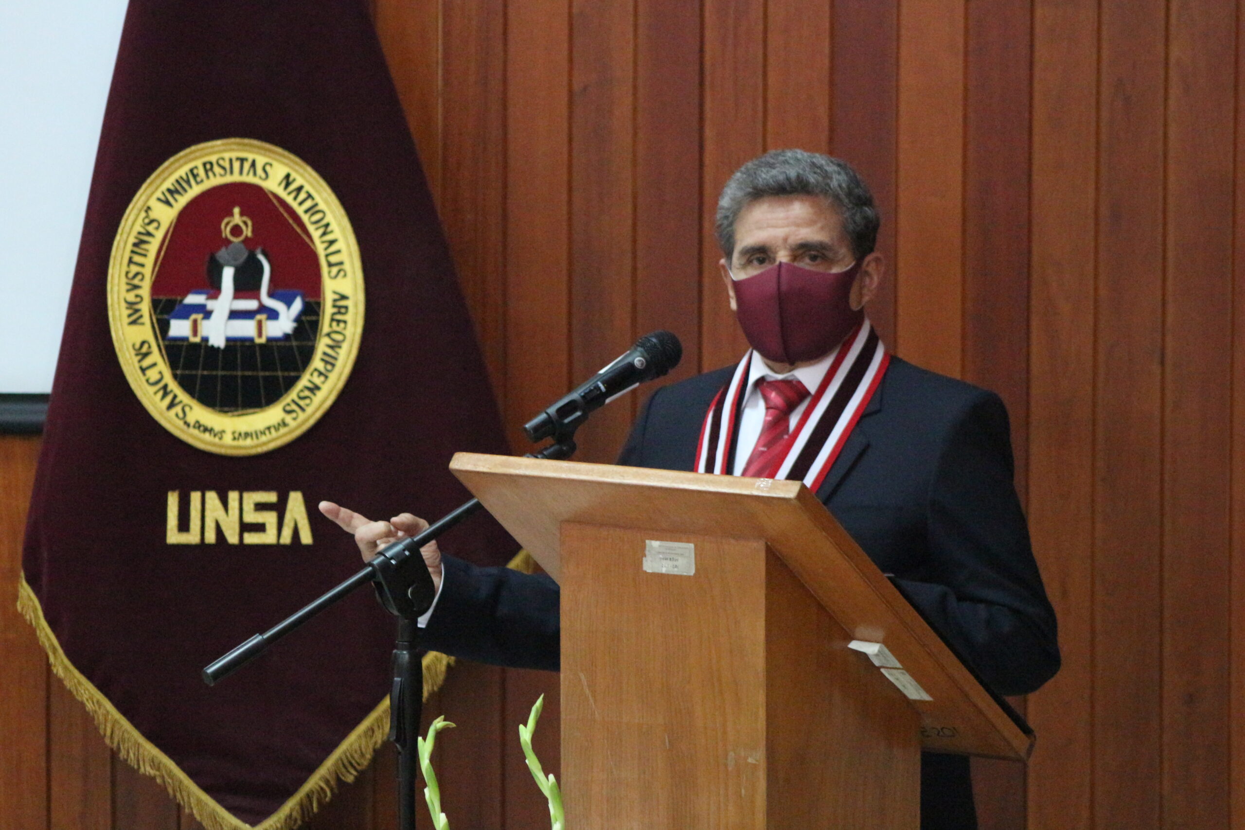 El Rector de la UNSA, Dr. Hugo Rojas Flores, fue el encargado de dar las palabras de reconocimiento para los catedráticos que debido a trabas burocráticas en el gobierno central no podían acceder a estos reconocimientos.