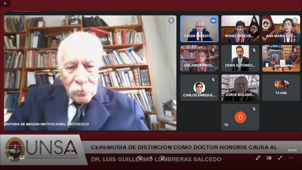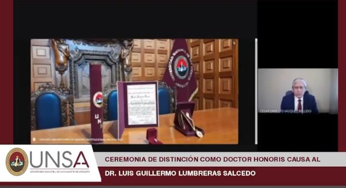 La pandemia y la emergencia sanitaria hicieron que la ceremonia protocolar se desarrolle el presente año y de manera virtual. Las autoridades agustinas, presididas por el rector, Dr. Rohel Sánchez Sánchez, entregaron de manera simbólica la medalla, resolución y diploma que acredita la investidura del Dr. Luis Lumbreras Salcedo.