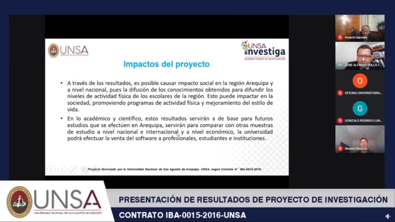 “El proyecto puede impactar en la sociedad, promoviendo programas de actividad físicas y mejoramiento del estilo de vida. En lo académico y científico estos resultados servirán para futuros estudios que se efectúen en Arequipa, servirán para comparar con otras muestras de estudios a nivel nacional e internacional”, dijo el Ing. José Sulla, en su presentación.