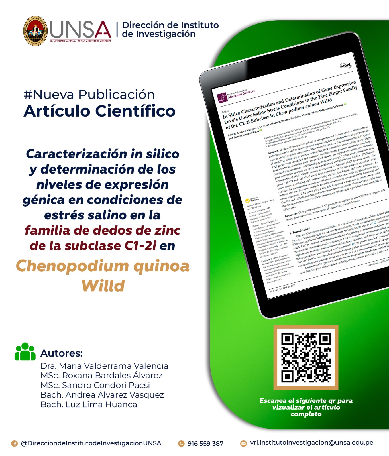 ¡Grandes noticias para el público general! La UNSA, a través del Laboratorio de Recursos Genéticos y Genérica Molecular está haciendo historia en la ciencia con un descubrimiento que puede transformar la agricultura y apoyar la seguridad alimentaria en todo el mundo. La investigación fue divulgada en la Revista Q1 (IF 4.9).