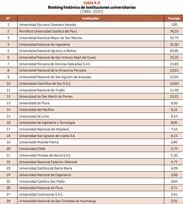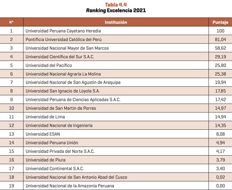 El puntaje asignado va de 0 a 100 puntos, donde los tres primeros lugares los ocupan la Universidad Peruana Cayetano Heredia, la Pontificia Universidad Católica del Perú y la Universidad Nacional Mayor de San Marcos.