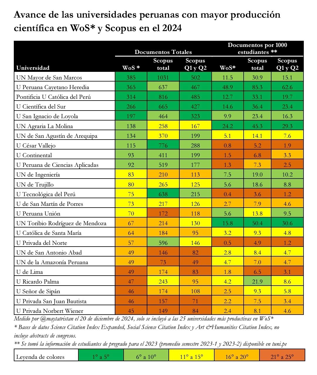 La Universidad Nacional de San Agustín de Arequipa (UNSA) se posiciona una vez más entre las universidades peruanas más destacadas en investigación científica. Según el informe elaborado por el investigador Percy Mayta Tristán, la UNSA ocupa el sétimo lugar nacional por el número de publicaciones en revistas indexadas durante el 2024 y es la primera entre las universidades fuera de Lima.