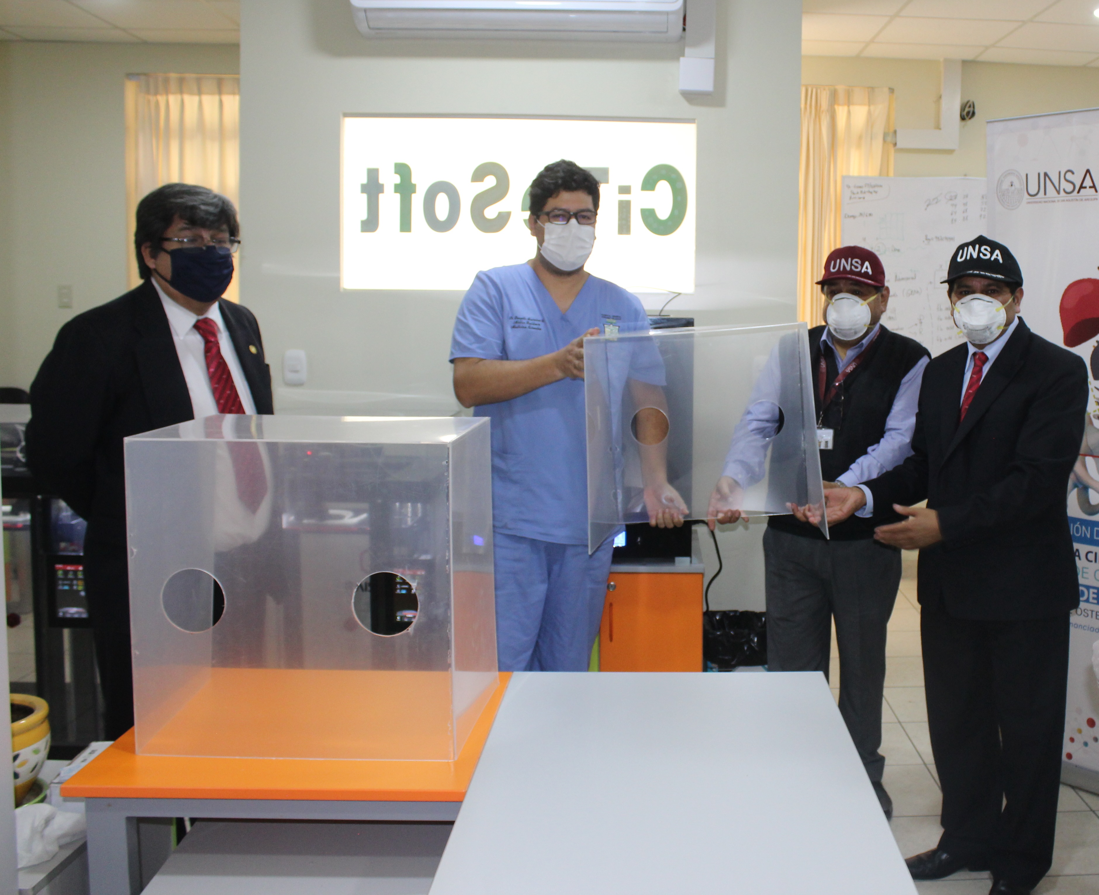 El Dr. Rohel Sánchez Sánchez, rector de la UNSA entregó 2 “Aerosol Box” para la Unidad de Cuidados Intensivos del Hospital Honorio Delgado;  y entregará 3 más para las áreas que atenderán a los pacientes diagnosticados con COVID – 19.