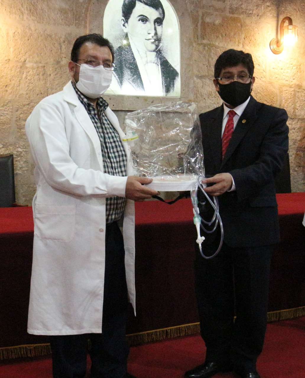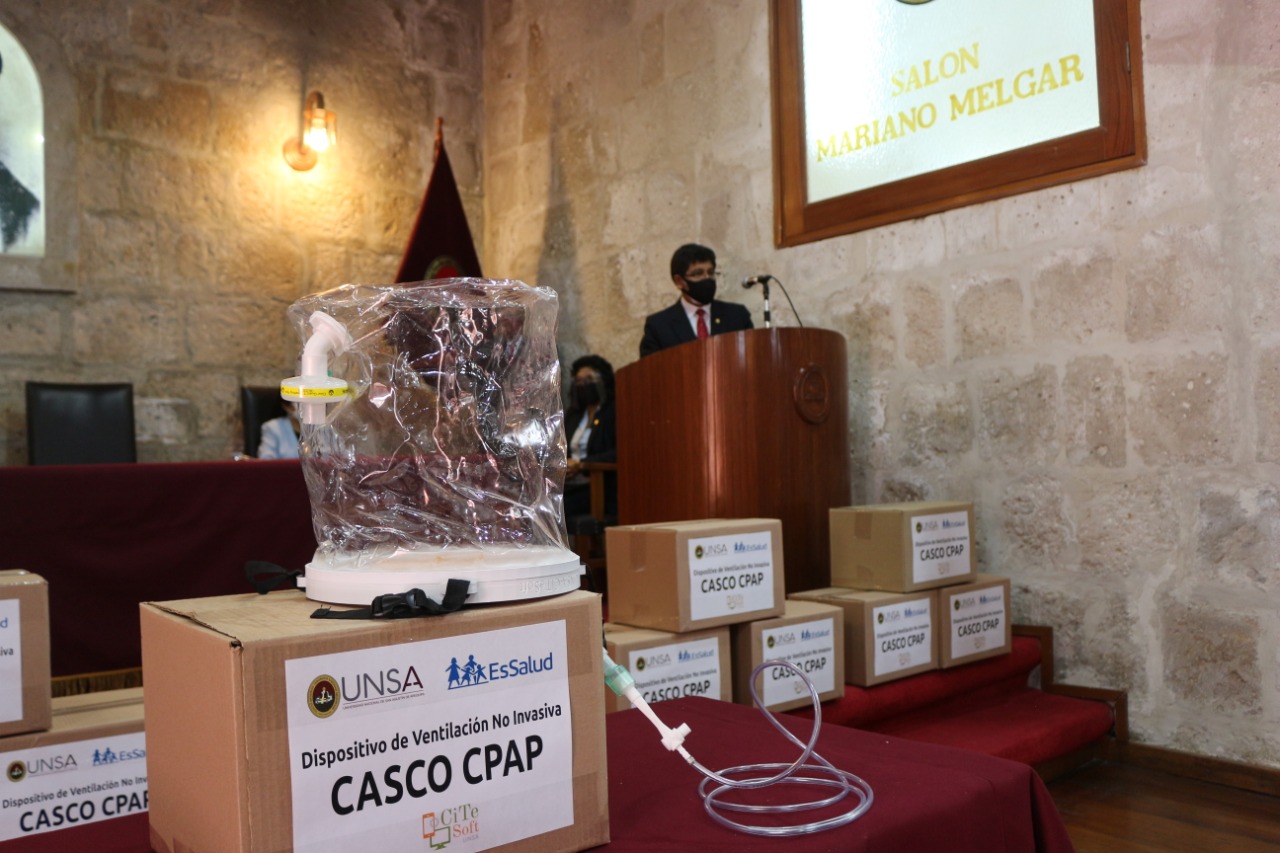 La Universidad Nacional de San Agustín de Arequipa entregó 12 cascos CPAP a los hospitales de Essalud y Honorio Delgado Espinoza para la atención de pacientes que requieran oxígeno y no cuentan con una cama UCI o ventilador mecánico.