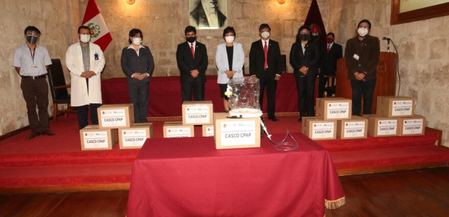 La Universidad Nacional de San Agustín de Arequipa entregó 12 cascos CPAP a los hospitales de Essalud y Honorio Delgado Espinoza para la atención de pacientes que requieran oxígeno y no cuentan con una cama UCI o ventilador mecánico.