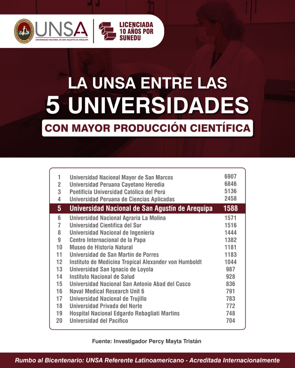 La UNSA se ubica en el quinto lugar entre las instituciones con mayor número de publicaciones científicas según el ranking elaborado por Scopus.