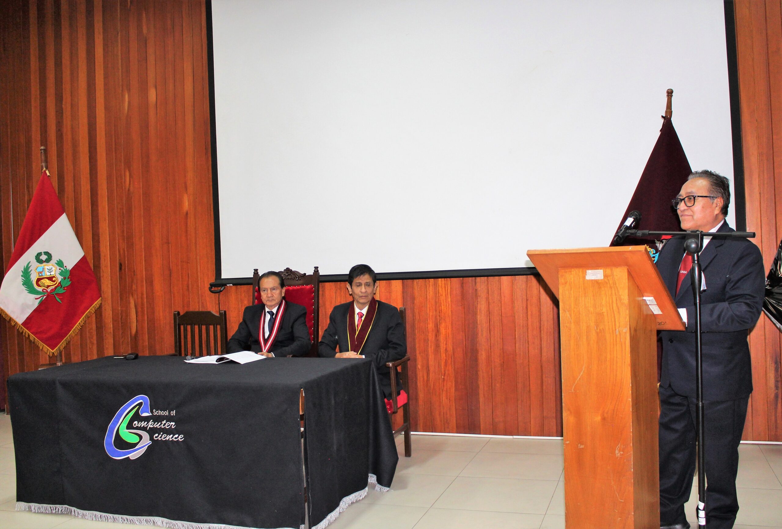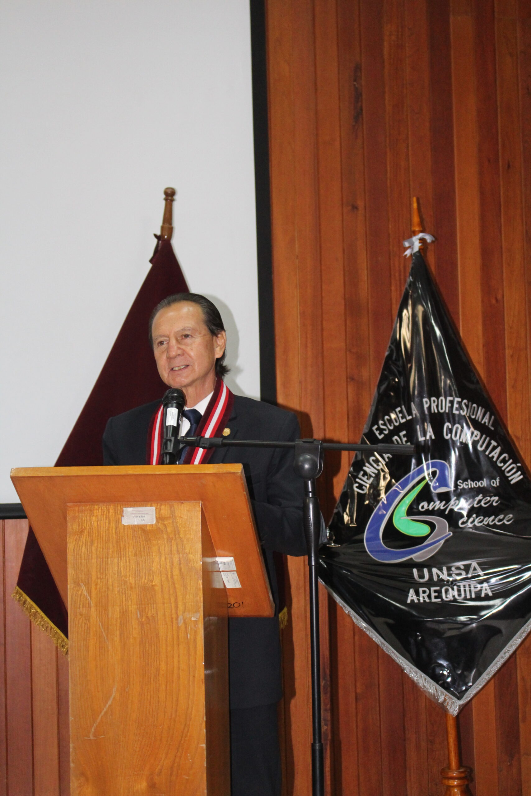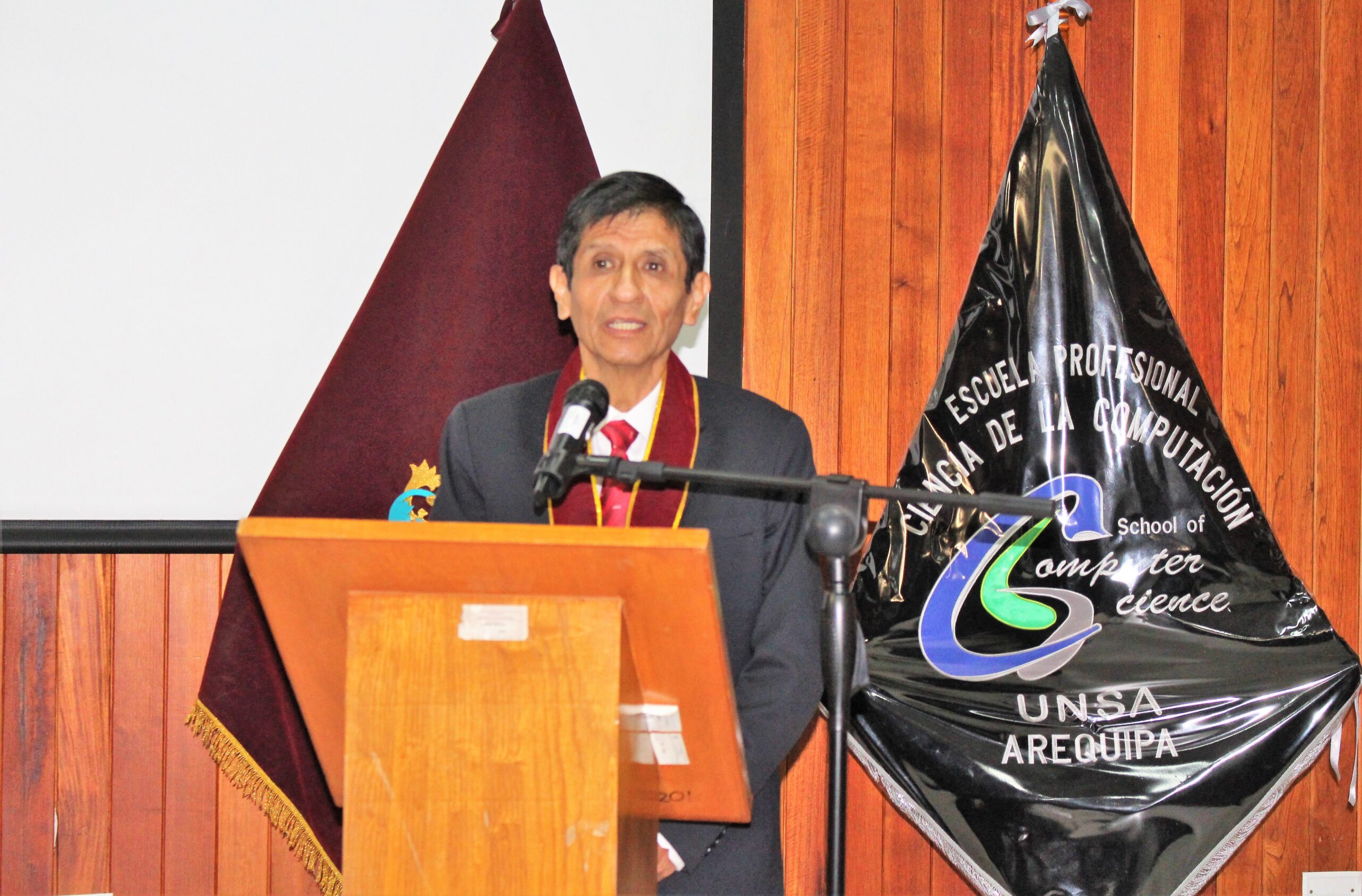 El Vicerrector Académico, Dr. Luis Cuadros Paz, resaltó que como ciencia la computación se ha convertido en la locomotora del desarrollo científico tecnológico. En ese sentido, señaló que la escuela de Ciencia de Computación de la UNSA se ha convertido en vitrina en la formación de buenos profesionales, caracterizándose por su buena infraestructura, la calidad de enseñanza y estar a la vanguardia de los avances tecnológicos. En esa línea, animó a sus integrantes a ser referentes no solo nacionales sino internacionales.