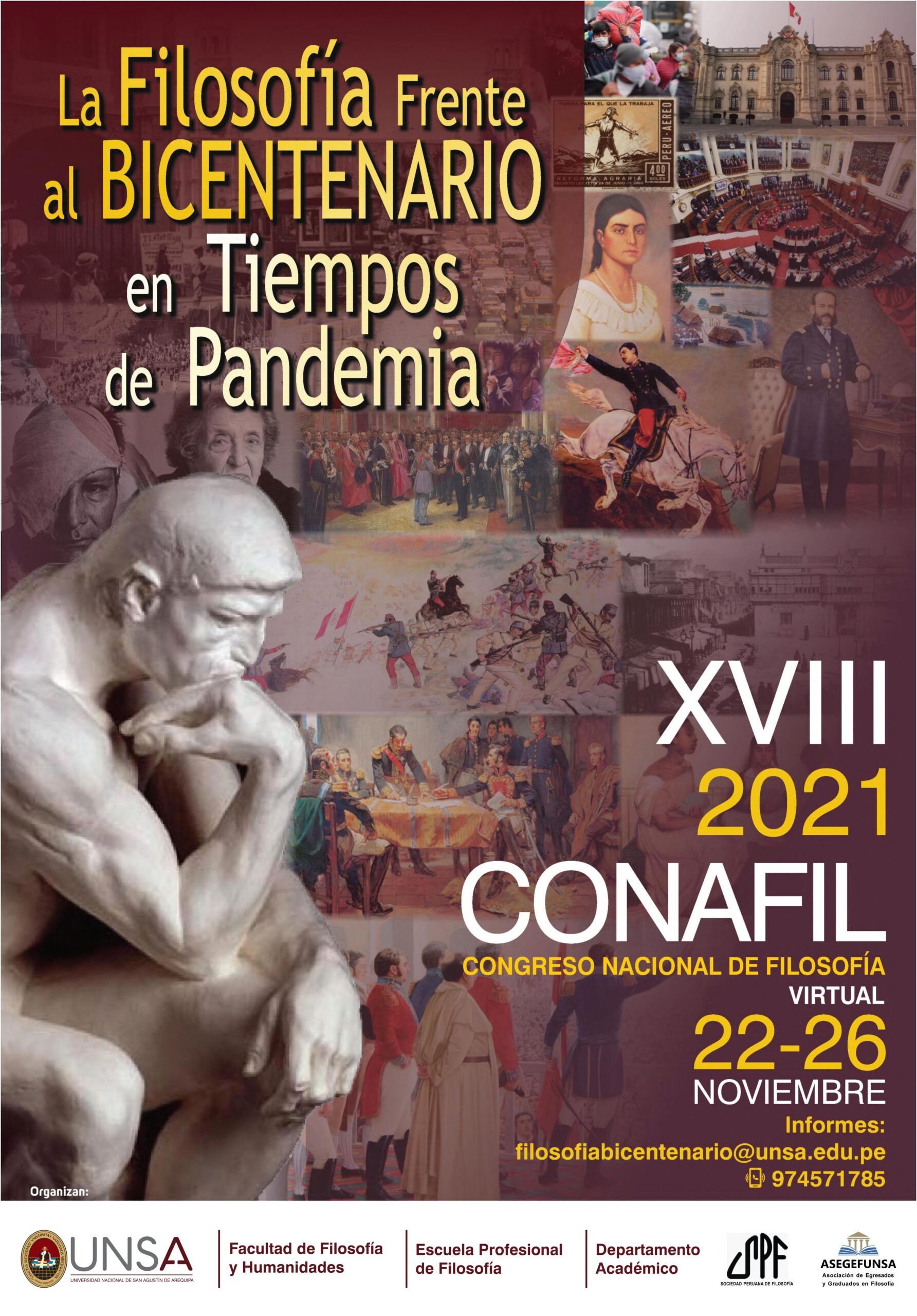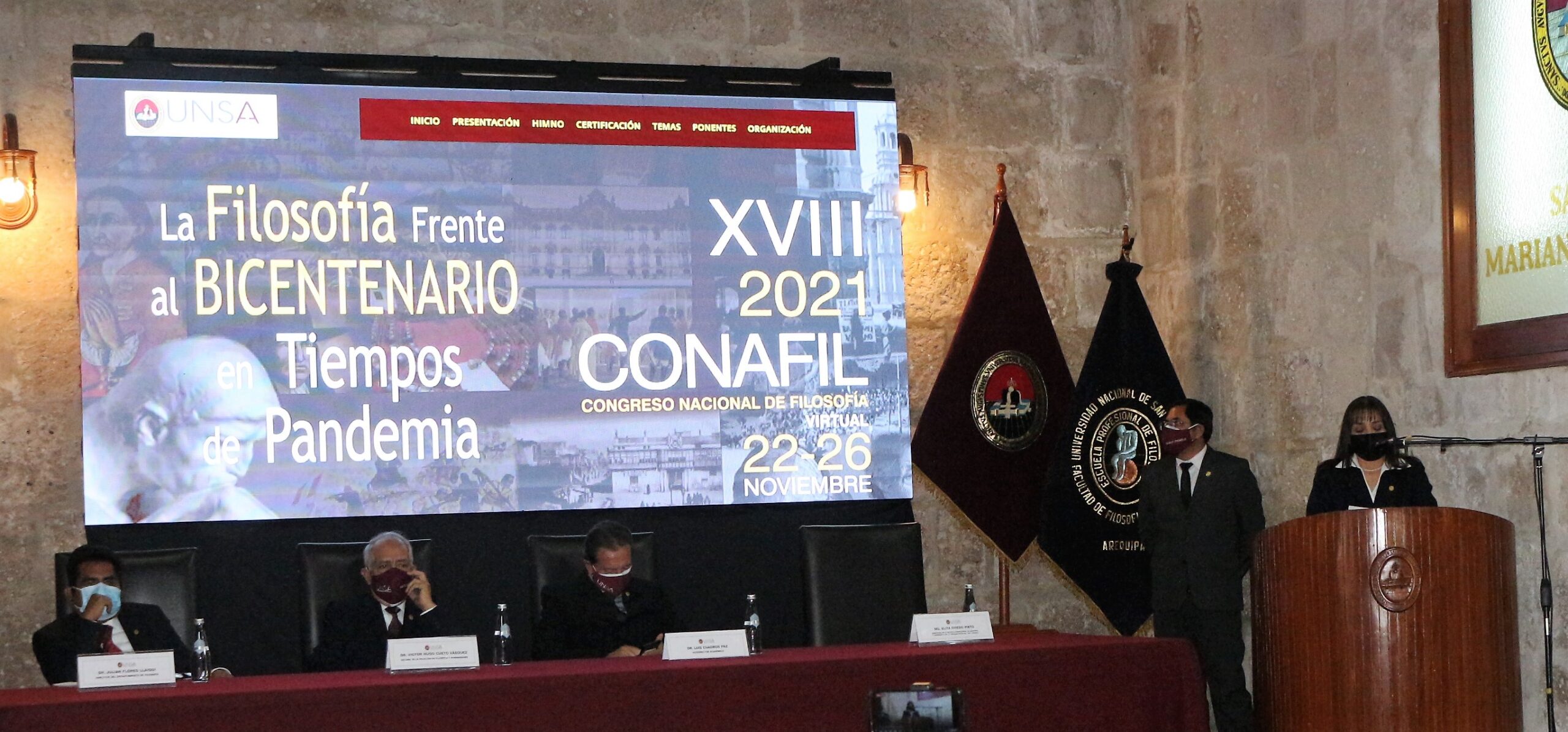 La Universidad Nacional de San Agustín de Arequipa organiza el Congreso Nacional de Filosofía CONAFIL 2021 “La Filosofía frente al Bicentenario en tiempos de pandemia”, espacio académico que se desarrollará de manera virtual del 22 al 26 de noviembre.