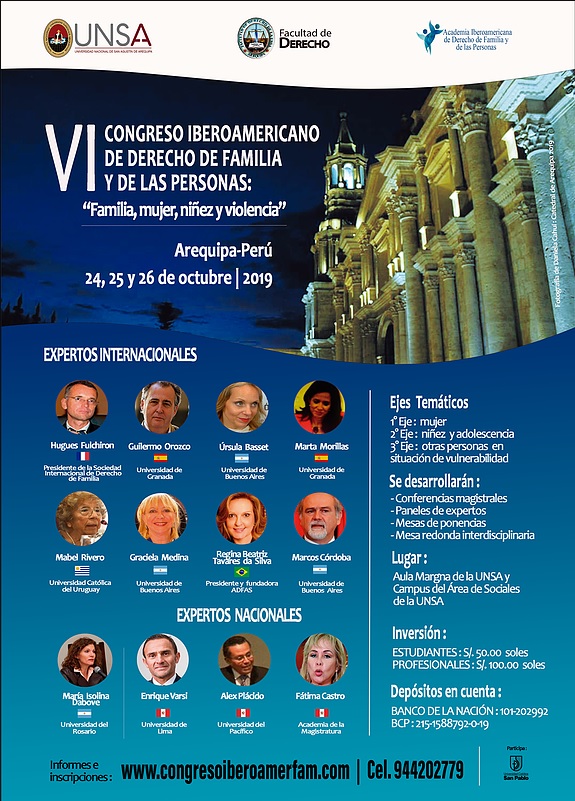 Para buscar alternativas multidisciplinarias a la violencia intrafamiliar, la Facultad de Derecho de la Universidad Nacional de San Agustín de Arequipa organiza en coordinación con la Academia Iberoamericana de Derecho de Familia y de las Personas y la participación de la Universidad Católica San Pablo, el VI Congreso Iberoamericano de Derecho de Familia y de las Personas que se realizará del 24 al 26 de octubre con la participación de reconocidos académicos.