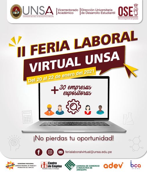 35 empresas nacionales de diferentes rubros presentarán su oferta laboral durante la Feria Laboral virtual que organiza la Universidad Nacional de San Agustín de Arequipa para su comunidad universitaria.