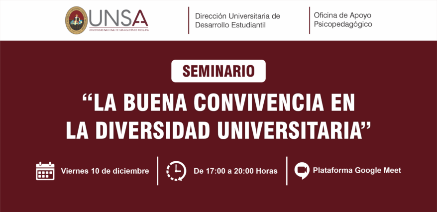La Dirección Universitaria de Desarrollo Estudiantil de la #UNSA, a través de la la Oficina de Apoyo Psicopedagógico realiza este viernes 10 de diciembre a las 17:00 horas el Seminario «La buena convivencia en la Diversidad Universitaria», que tiene como objetivo promover una convivencia universitaria en base a valores, en una cultura de respeto hacia la diversidad.
