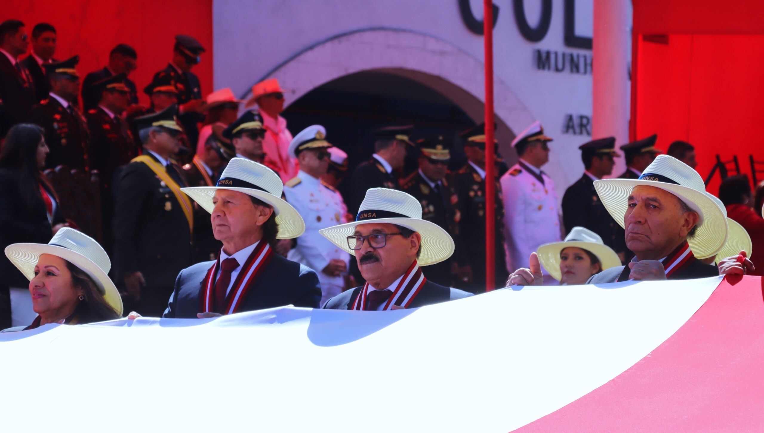 La Universidad Nacional de San Agustín de Arequipa (UNSA) tomó parte en el desfile cívico-militar que se llevó a cabo en la Av. Independencia, en el marco de las celebraciones por las Fiestas Patrias 2024. Fundada el 11 de noviembre de 1828, la UNSA es una de las universidades más antiguas del Perú, actualmente bajo la dirección del rector, Dr. Hugo José Rojas Flores, junto al vicerrector académico, Dr. Luis Cuadros Paz y el vicerrector de investigación, Dr. Henry Polanco Cornejo. estuvieron acompañados de la secretaria general de la universidad, Dra. Rut Maritza Chirinos Lazo, decanos y representantes estudiantiles.