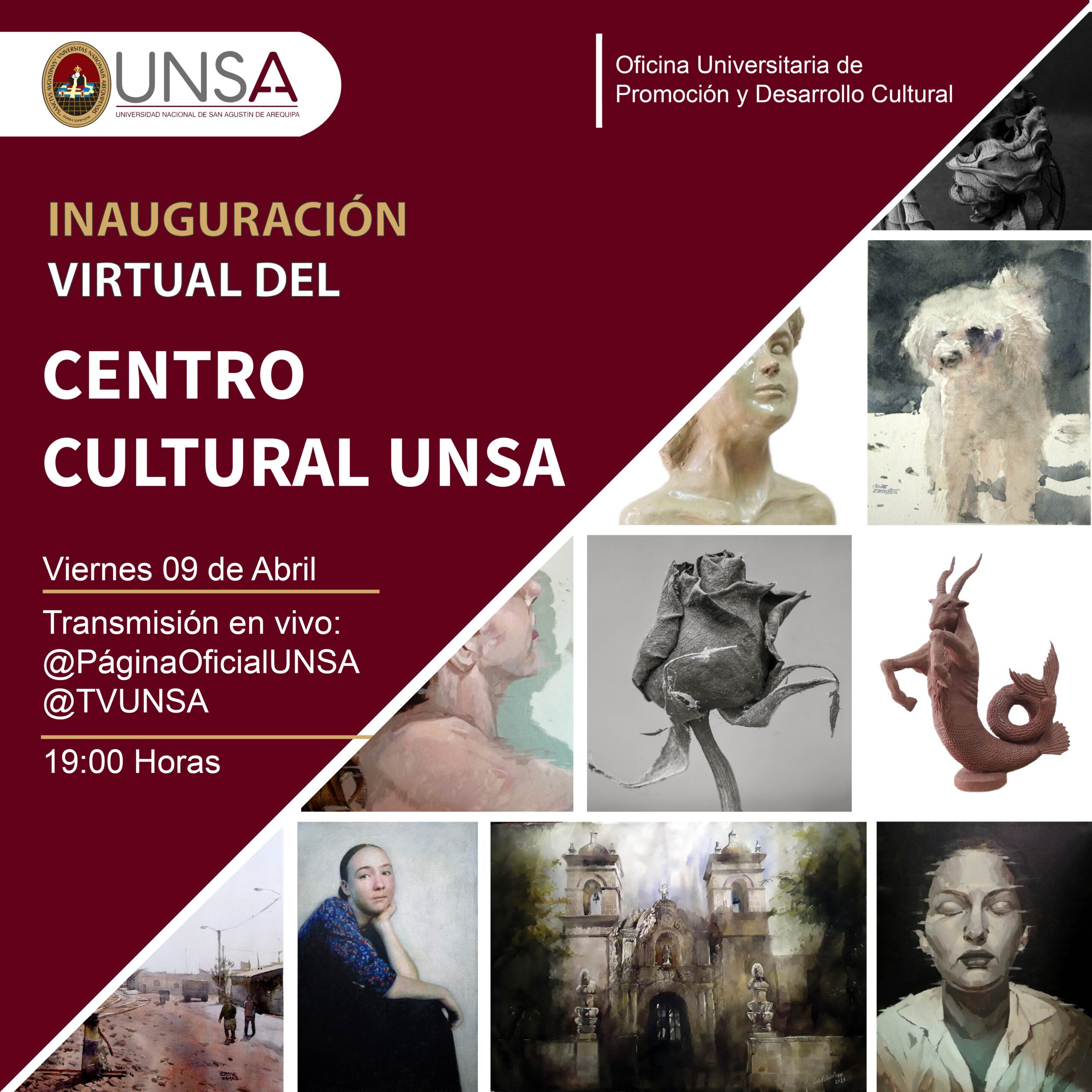 La inauguración es este viernes 09 de abril a las 19:00 horas. se contará con la participación de las principales autoridades de la universidad y de los artistas expositores. Será transmitido por el Facebook Institucional de la UNSA. https://www.facebook.com/PaginaOficialUNSA