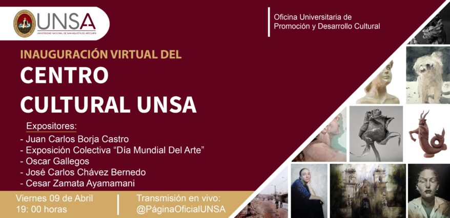 La Universidad Nacional de San Agustín de Arequipa a través de la Oficina Universitaria de Promoción y Desarrollo Cultural, presentan la inauguración virtual de las exposiciones artísticas correspondiente al mes de abril, como parte de las actividades programadas por el Centro Cultural UNSA.