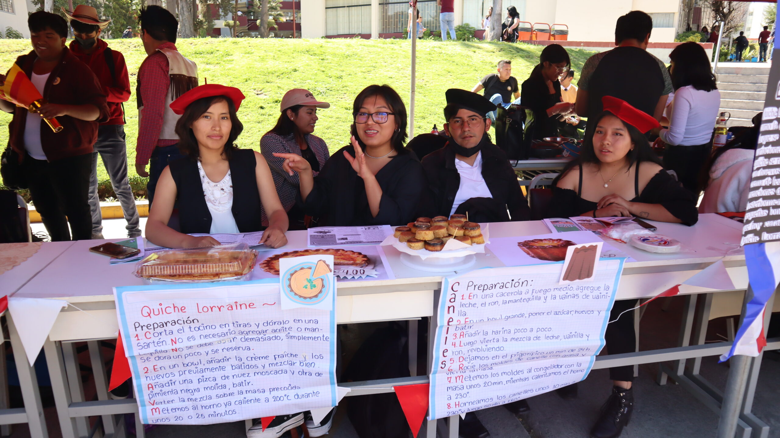 Por parte de los estudiantes de cuarto año, durante este semestre académico desarrollaron el curso de literatura y cultura de países de habla francesa en el puesto decorado con colores de la bandera francesa se encontraron crepes, macarons, kiss loraine y ratatouille.