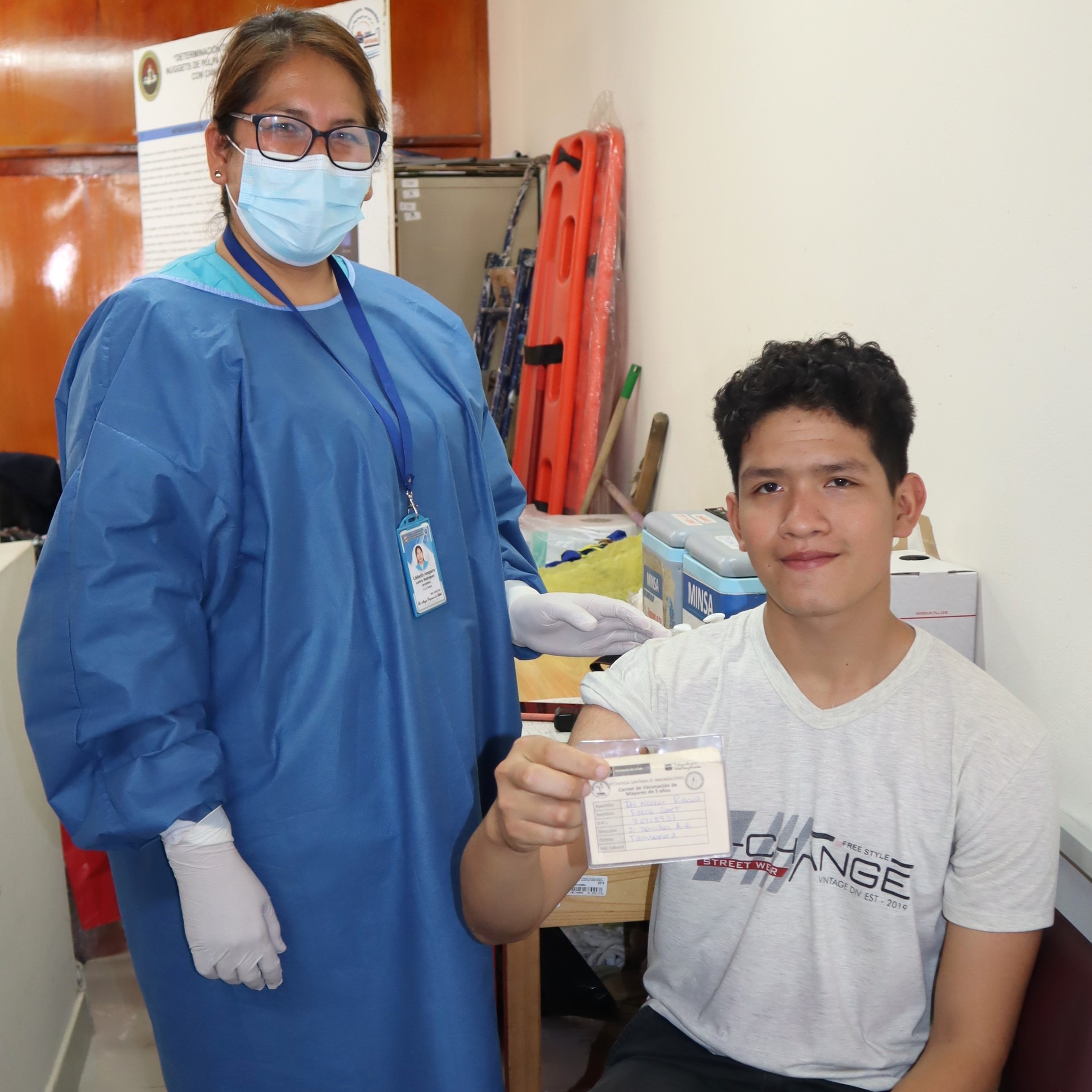 Fabio del Alcázar Racua, estudiante del tercer año de Medicina recibió vacunas de la influenza y la tercera dosis contra el tétanos, la Enfermera Lisbeth Larico Rodríguez lo atendió gentilmente.
