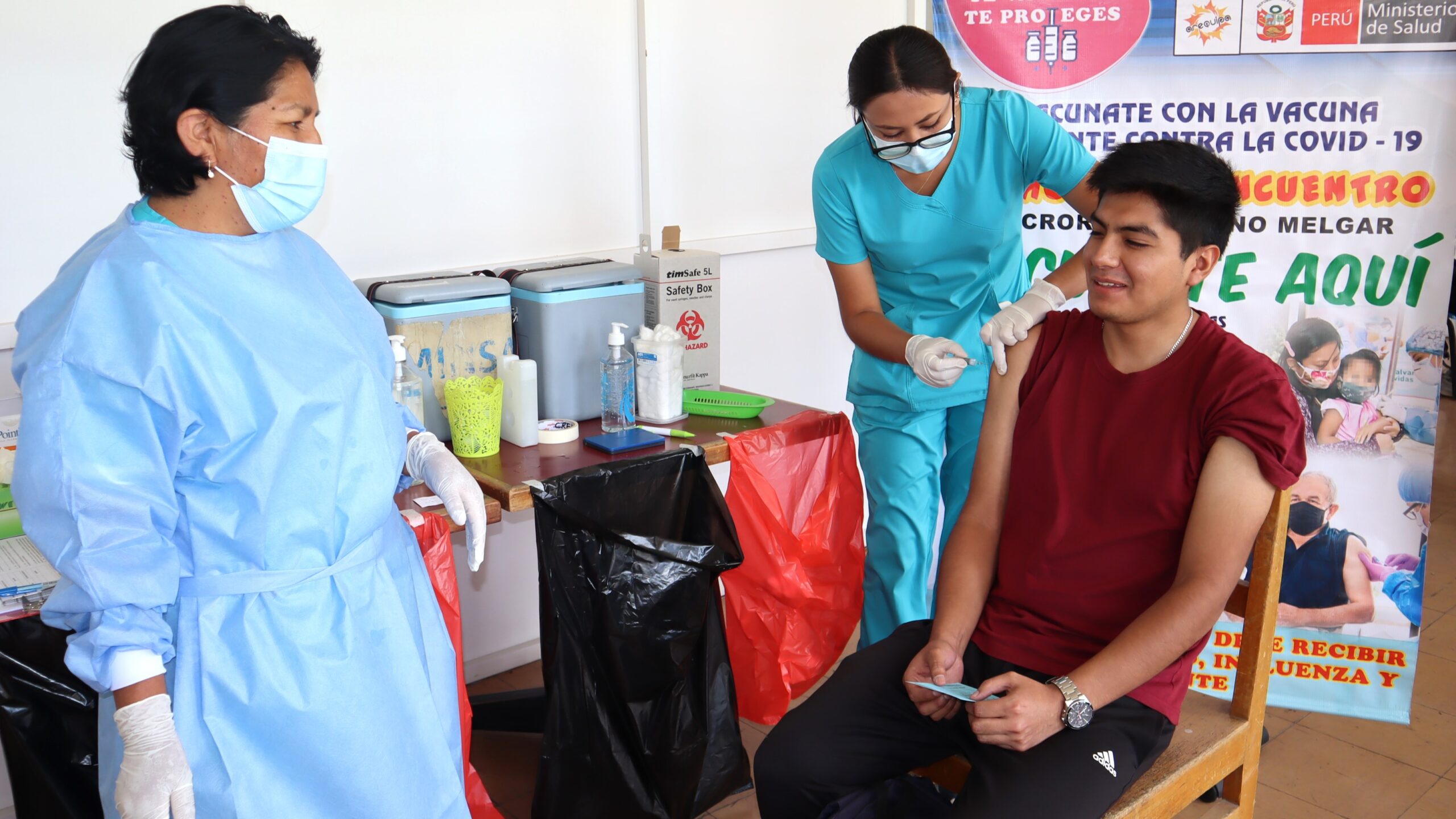 Fabio del Alcázar Racua, estudiante del tercer año de Medicina recibió vacunas de la influenza y la tercera dosis contra el tétanos, la Enfermera Lisbeth Larico Rodríguez lo atendió gentilmente.
