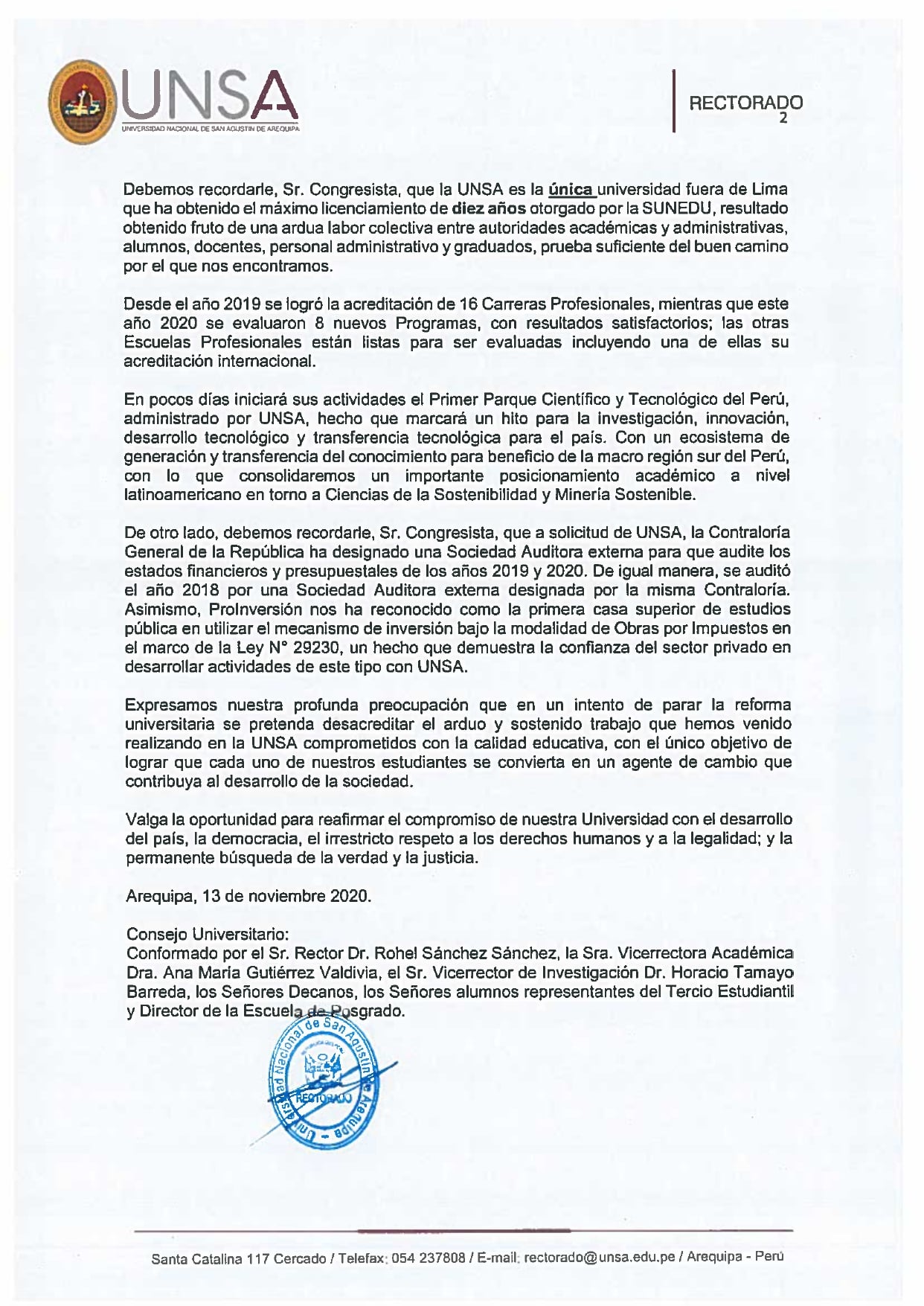 Email: rectorado@unsa.edu.pe