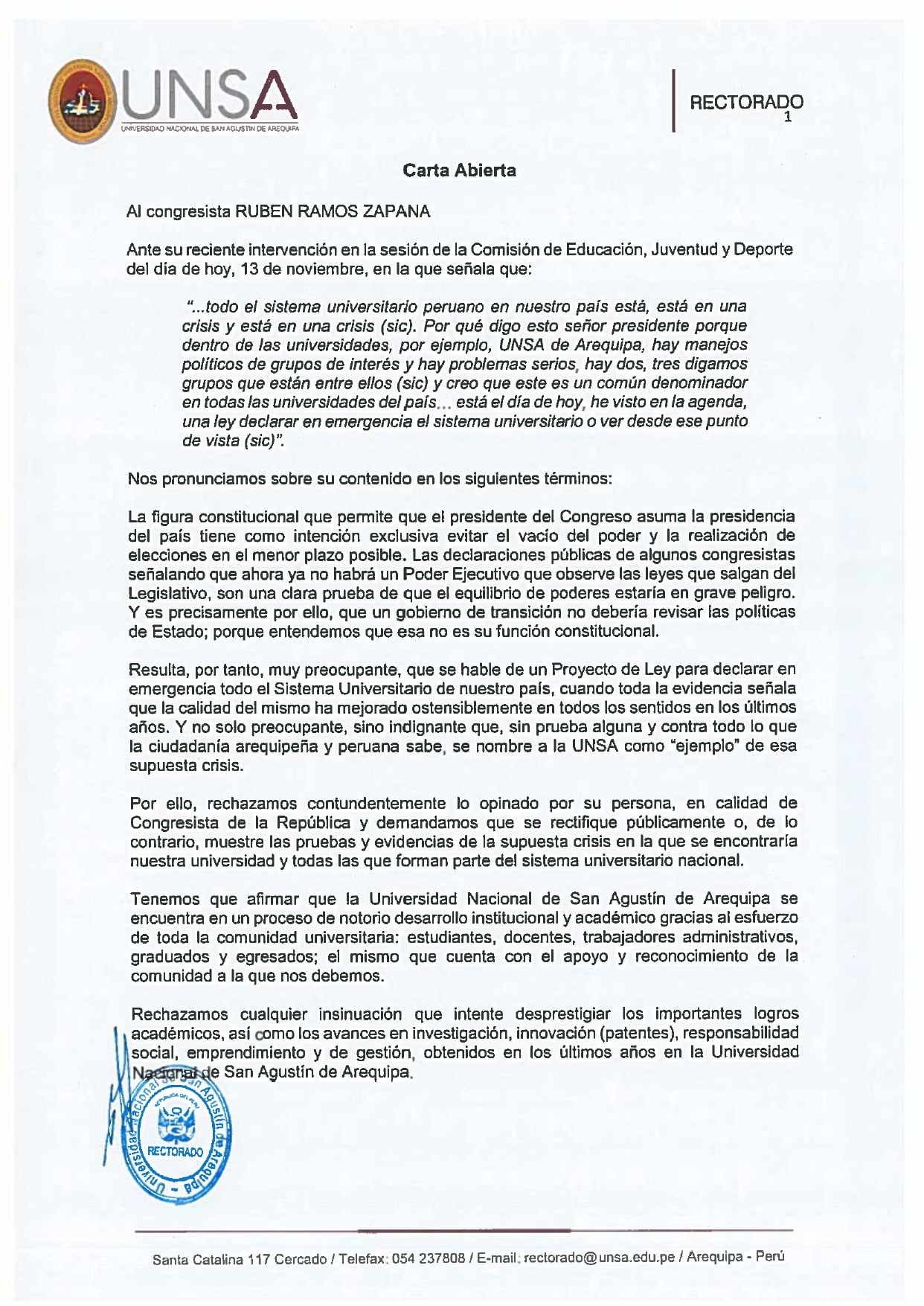 El Consejo Universitario de la Universidad Nacional de San Agustín de Arequipa (UNSA) rechazó las declaraciones del parlamentario de Unión Por el Perú (UPP), Rubén Ramos Zapana, quien habló sobre una crisis en el sistema universitario en el país, poniendo de ejemplo a la Casa Agustina, asegurando que existen intereses políticos de dos o tres grupos en su interior.