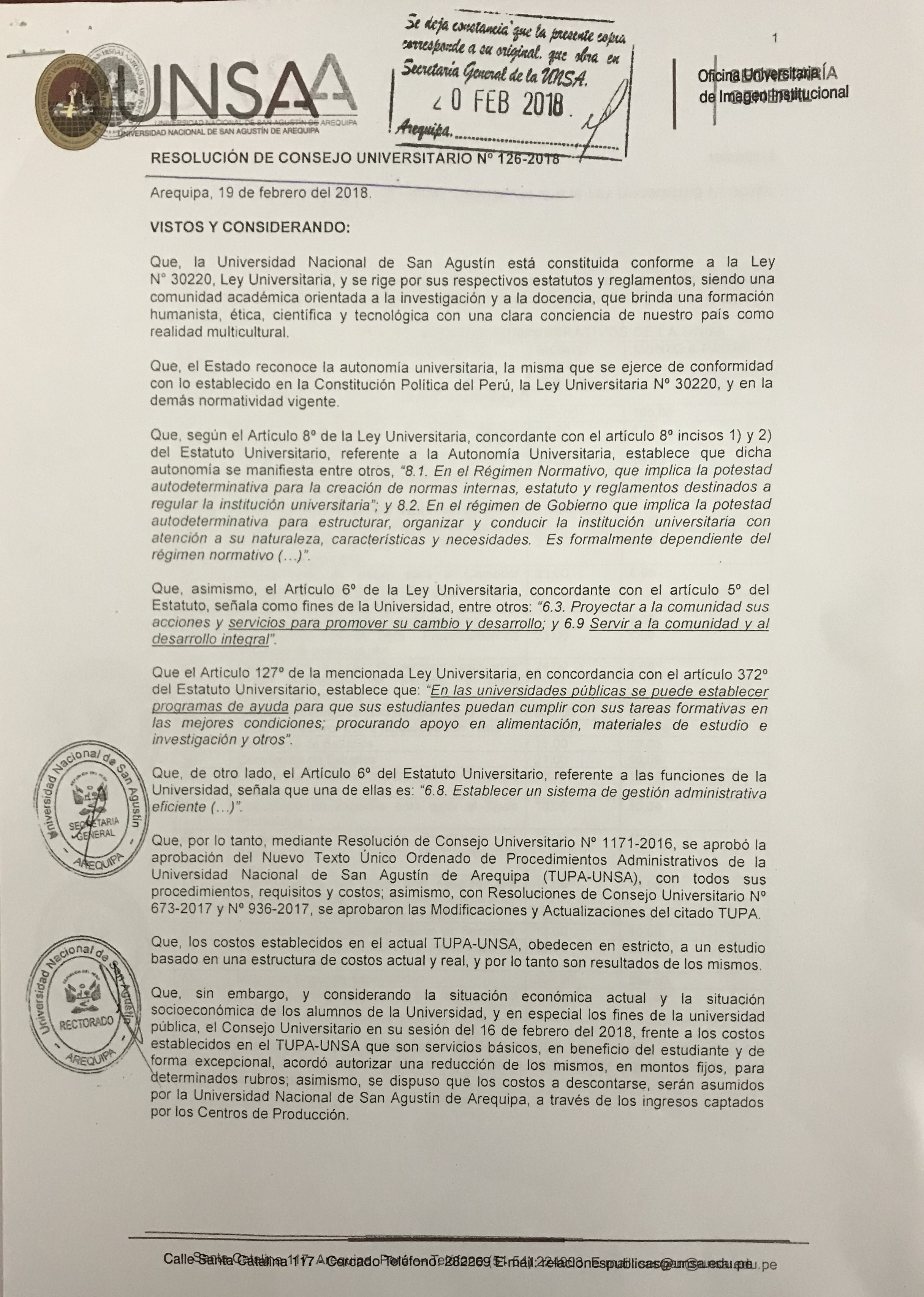 Considerando la situación socioeconómica de sus alumnos y en especial los fines de la universidad pública, la Universidad Nacional de San Agustín de Arequipa, en sesión de Consejo Universitario del 16 de febrero del presente año, aprobó de manera excepcional, la reducción de costos por diferentes derechos académicos