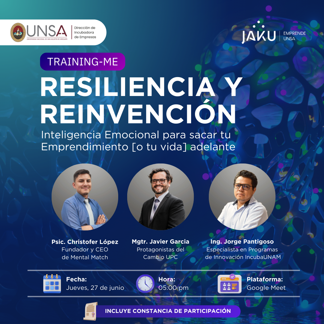 Frente a este reto, la incubadora de empresas de la Universidad Nacional de San Agustín de Arequipa (UNSA), JAKU Emprende UNSA, realiza el primer workshop “Resiliencia y reinvención: Inteligencia Emocional para sacar tu emprendimiento [o tu vida] adelante”, que forma parte de las actividades del programa Training-Me, destinado a realizar eventos mensuales para promover con contenido de valor la cultura emprendedora.