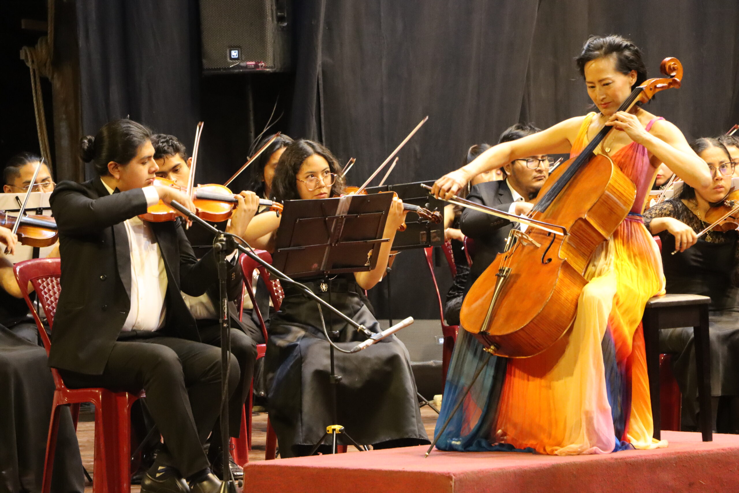 Anderson, una virtuosa taiwanesa radicada en Estados Unidos con formación en Harvard University, Juilliard School of Music y The University of North Carolina at Greensboro, brilló como solista en uno de los momentos cumbres del concierto. Su participación no se limitó al escenario principal; también impartió – en días anteriores- talleres de violonchelo a estudiantes de la escuela de Artes de la UNSA, una experiencia enriquecedora para los jóvenes músicos y aficionados a la música clásica que abarrotaron el teatro.