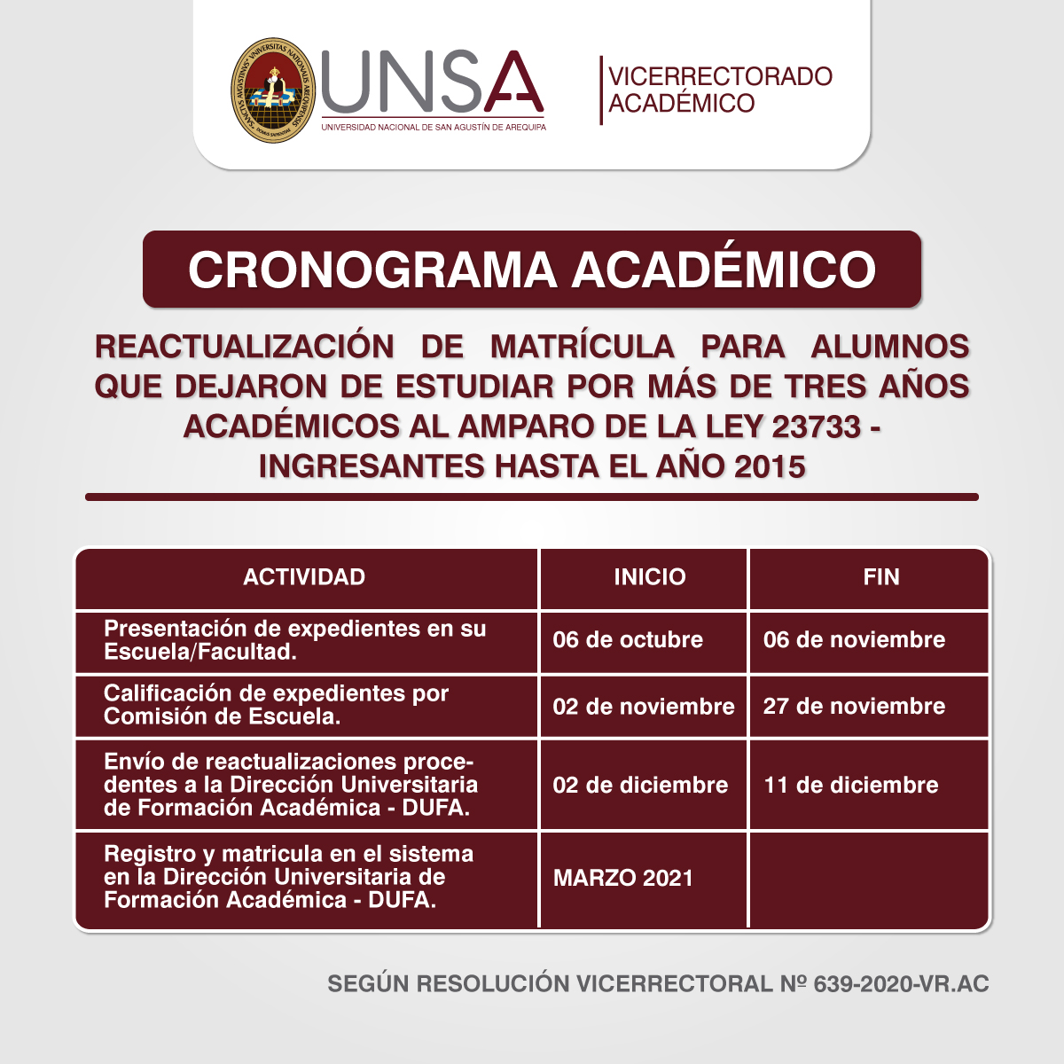 El Vicerrectorado Académico a través de la Resolución Vicerretoral N° 639 del 02 de octubre del 2020, aprobó el CRONOGRAMA de Reactualización de Matrícula para Alumnos que dejaron de estudiar por más de tres (3) Años Académicos.